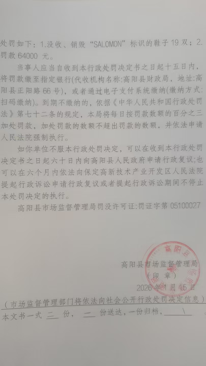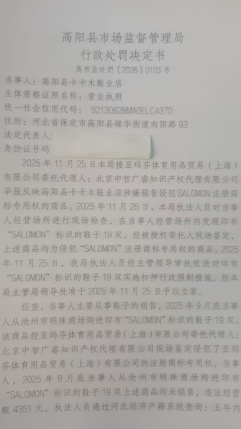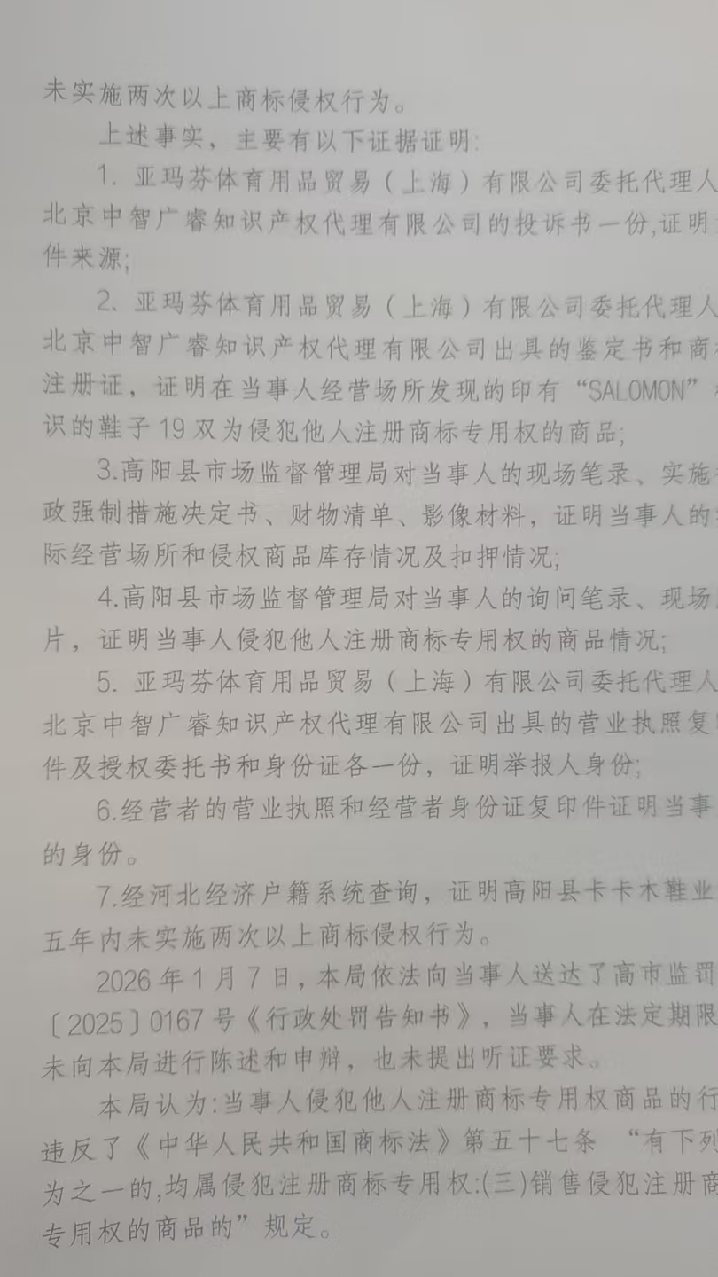 高阳县卡卡木鞋业店涉嫌销售侵犯SALOMON注册商标专用权的商品
