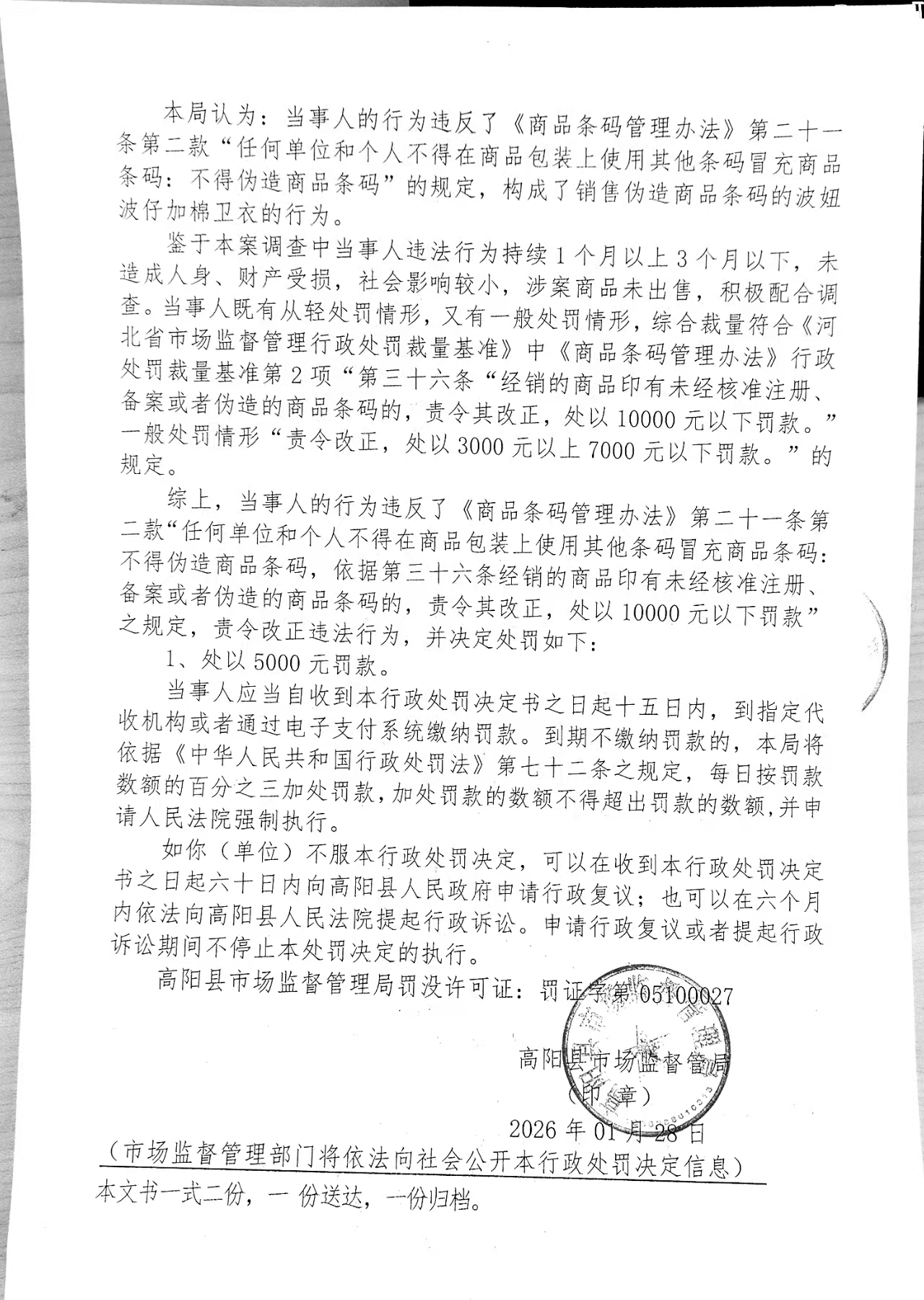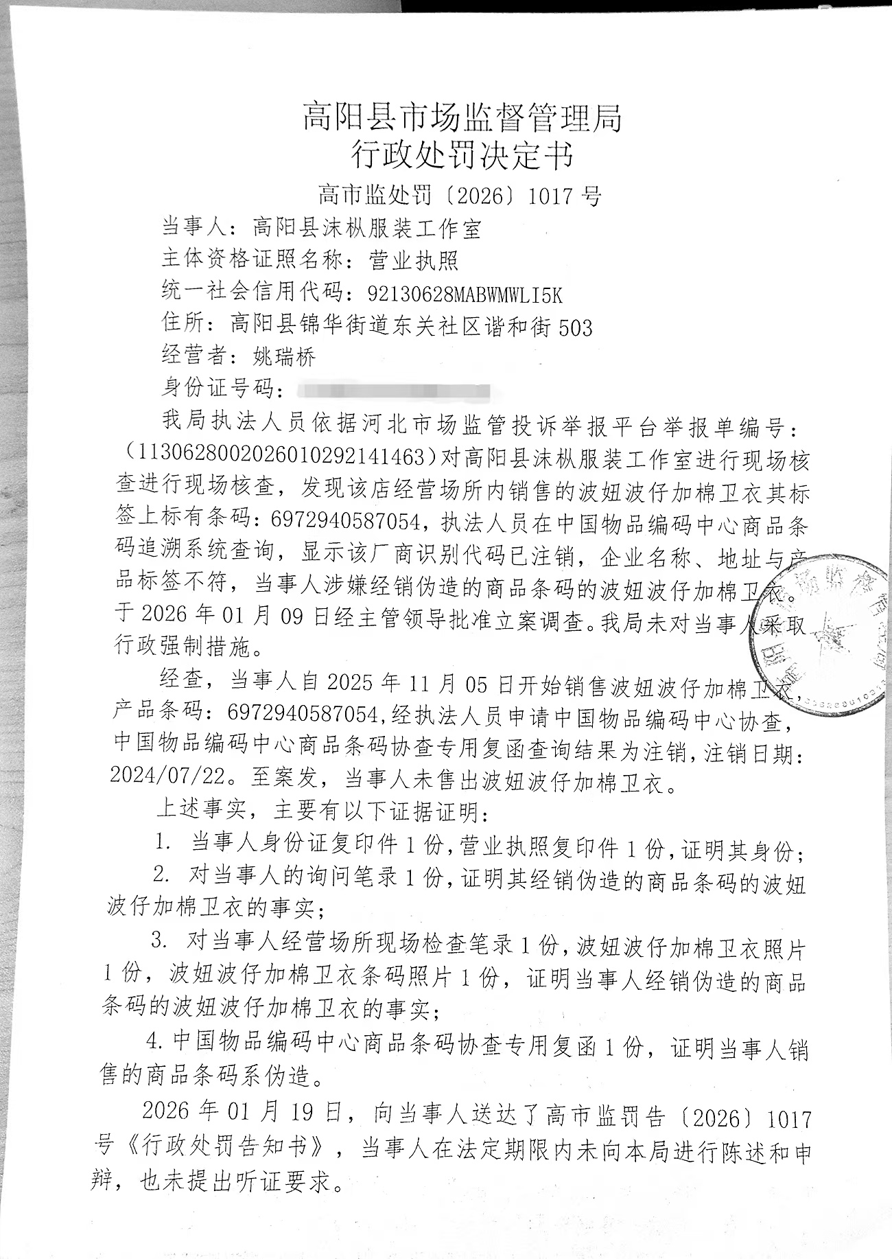 高阳县沫枞服装工作室经销伪造的商品条码的加棉卫衣案