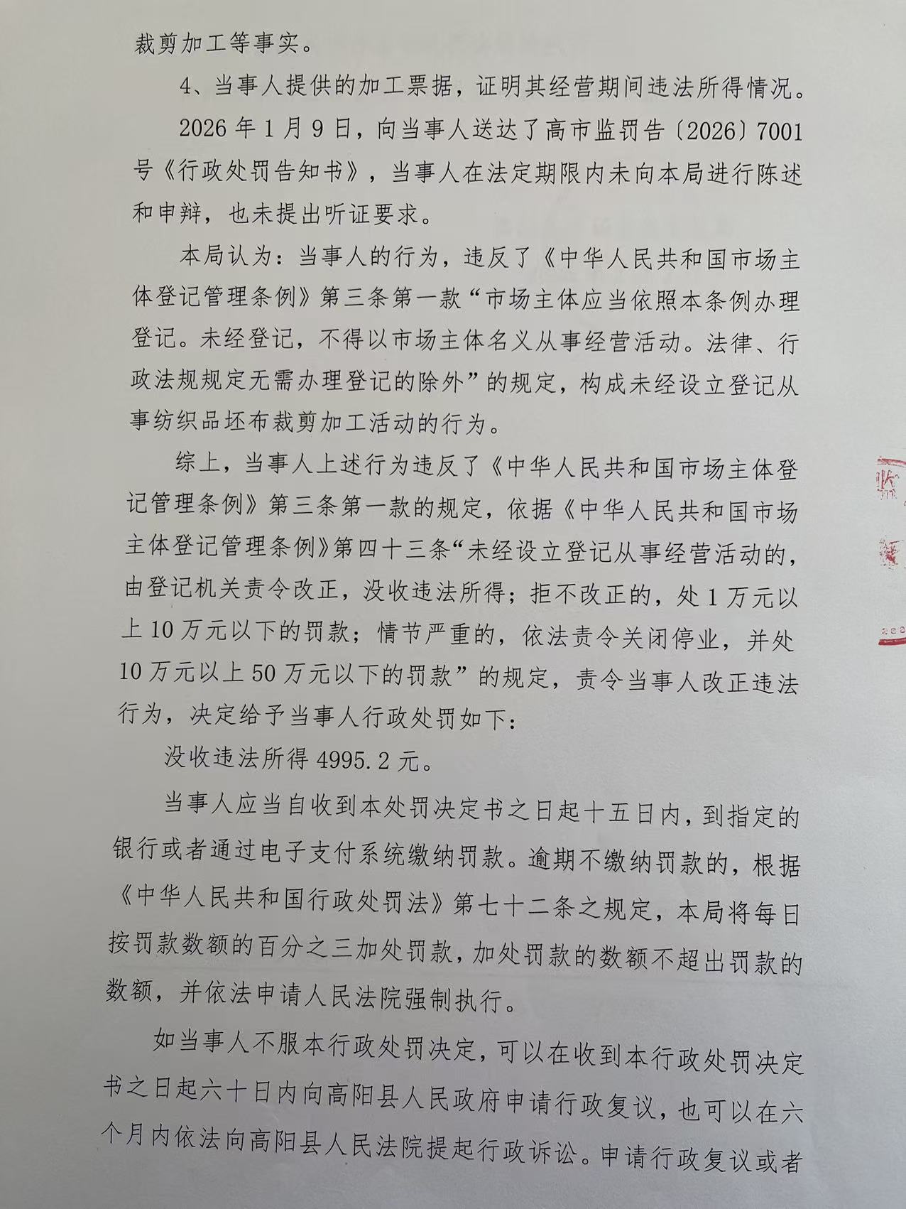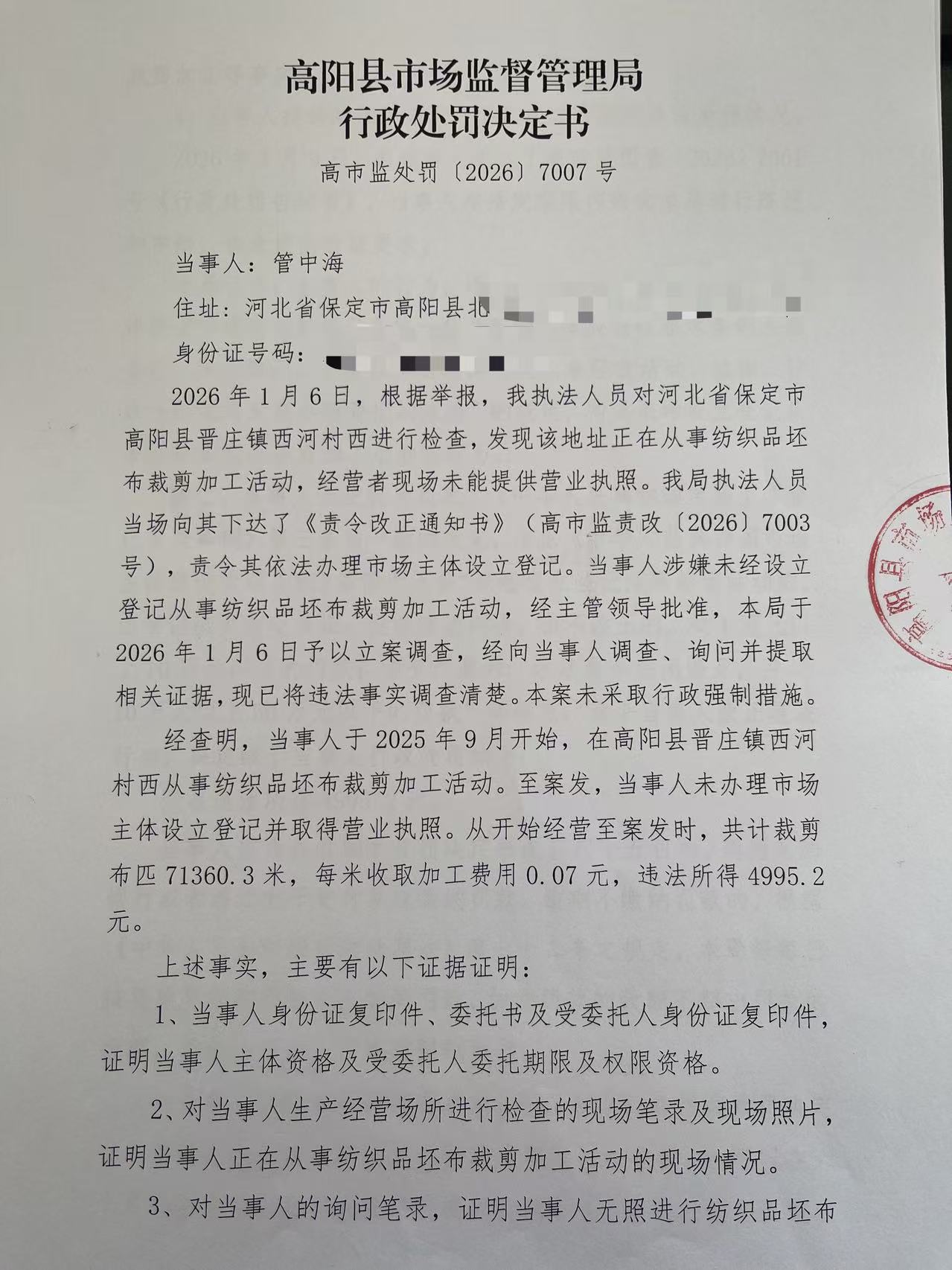 管中海未经设立登记从事纺织品坯布裁剪加工活动案