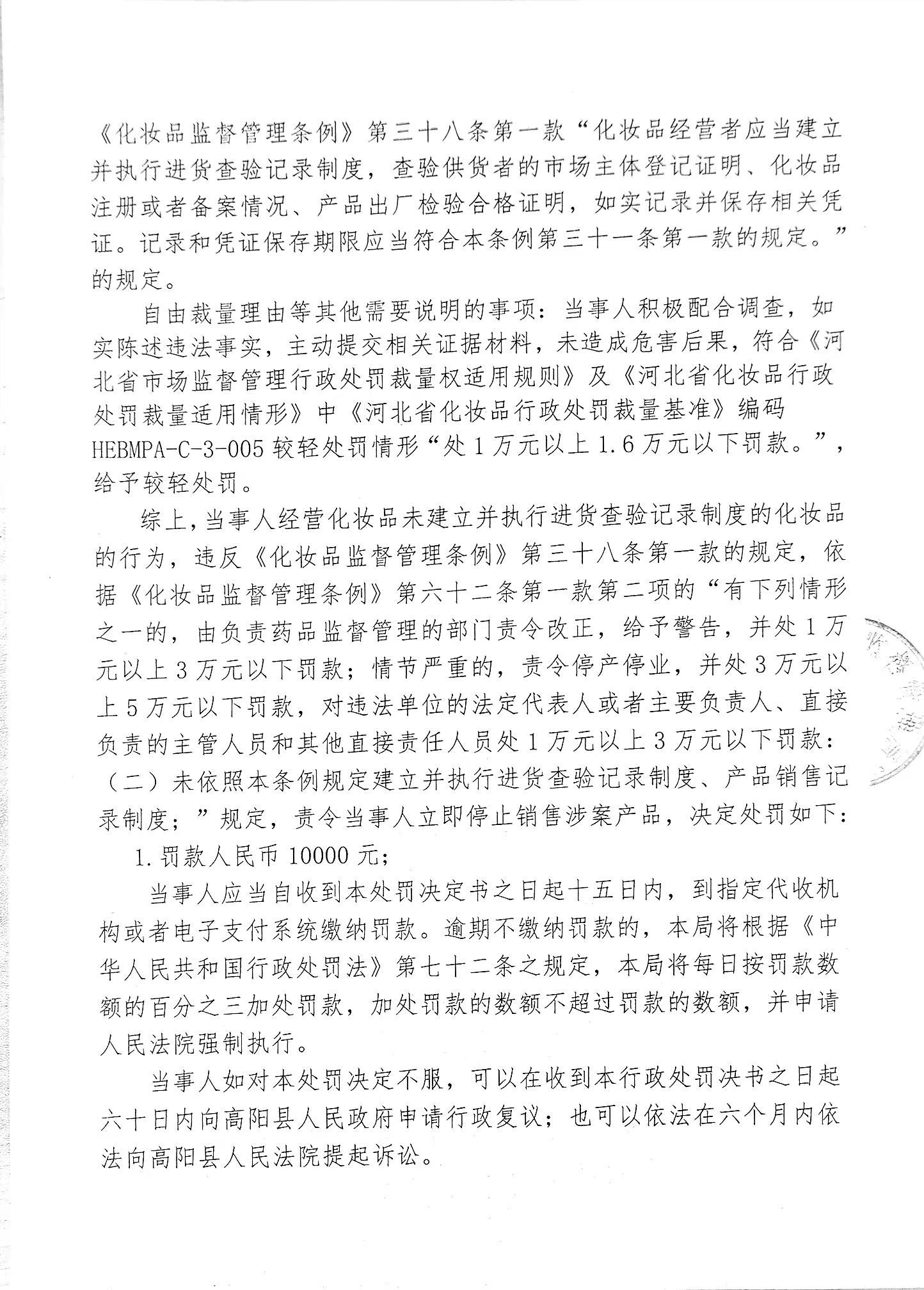 高阳县娟姐婴童纺织品经营部涉嫌经营化妆品未建立并执行进货查验记录制度案