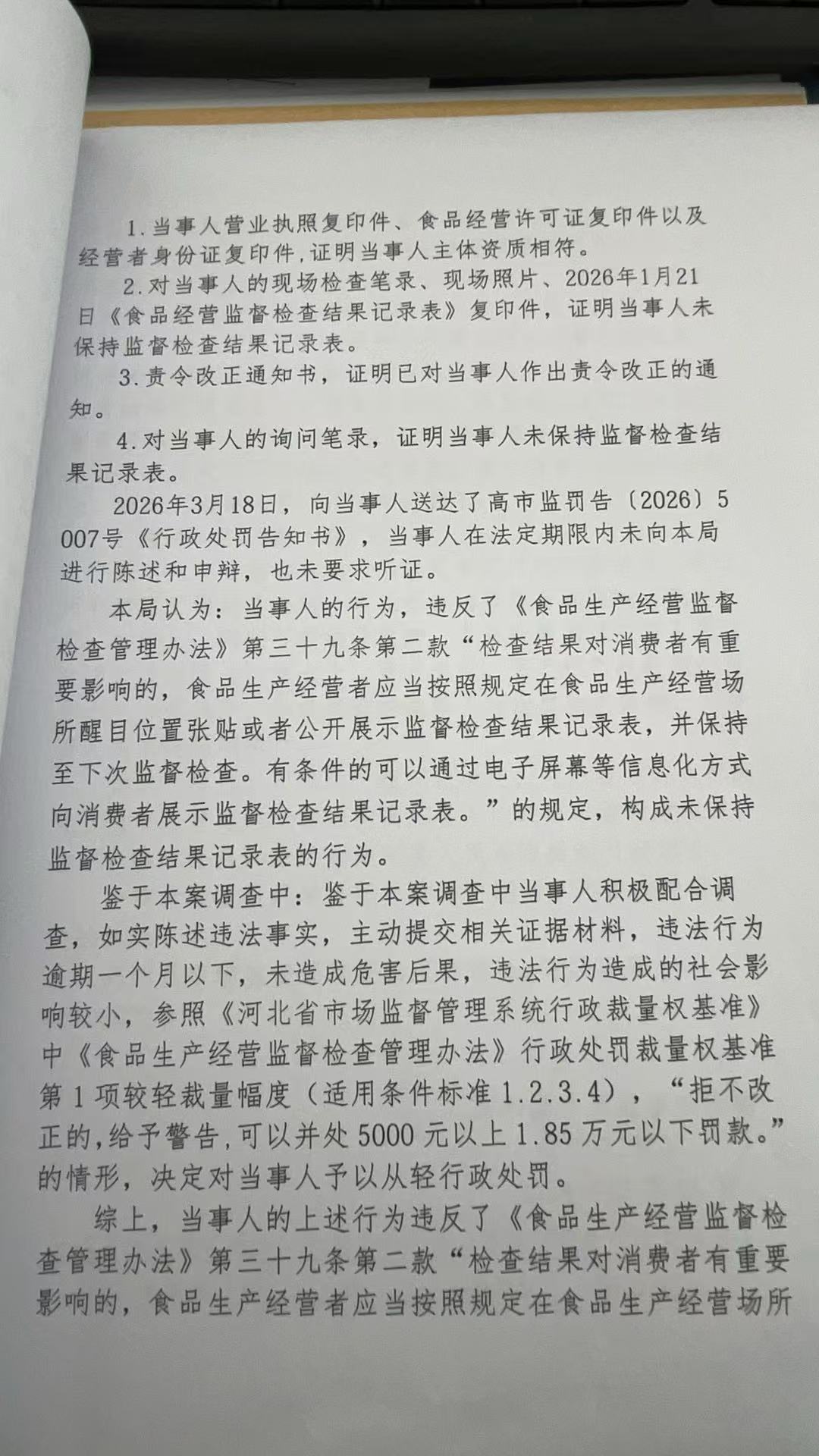 高阳县月辉副食经销部未保持监督检查结果记录表案