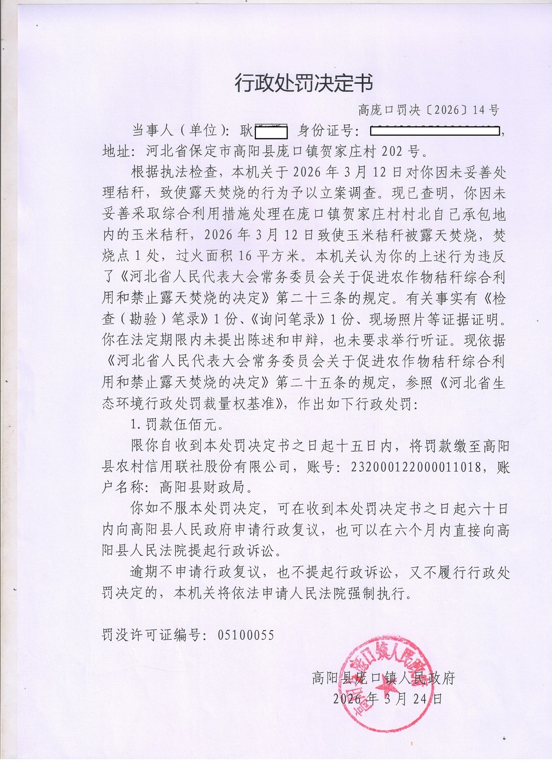 庞口镇贺家庄村耿某某为妥善处理秸秆致使露天焚烧
