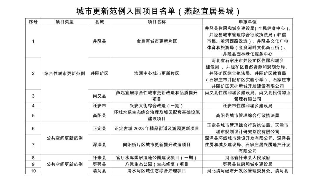 按照省政府办公厅《关于实施城市更新行动的指导意见》(冀政办字〔2023〕114号)中“选树优秀案例”的要求,我厅于今年2月份启动首届河北省城市更新范例征评工作。从省城市更新专家智库中选取资深行业专家,经“行业推荐、专家初评、现场踏勘、专家复评、综合复议”等程序,选出符合条件的40个入围项目,现将名单予以公示。公示期为2024年6月12日至6月18日。