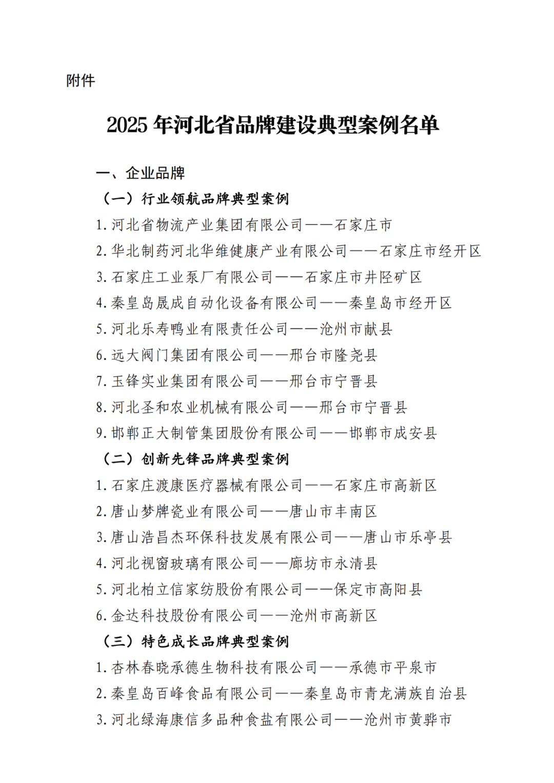 为深入贯彻落实省委、省政府“十四五”品牌发展规划战略部署,全面推动我省品牌建设工作提质增效,在河北省发展和改革委员会指导下,河北省品牌战略促进会联合纵览传媒(河北新闻网)组织开展了2025年河北省品牌建设典型案例征集宣传工作。经自主申报、资质复核、专家研讨等严格程序,最终确定河北物流、远大阀门、玉锋实业、河北净菜、高阳毛巾等28个品牌建设典型案例,现将名单予以发布(详见附件)。