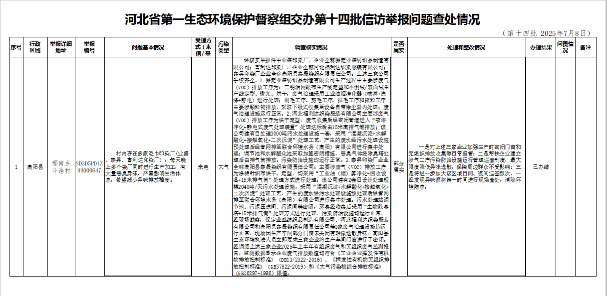 河北省第一生态环境保护督察组交办第十四批信访举报问题查处情况