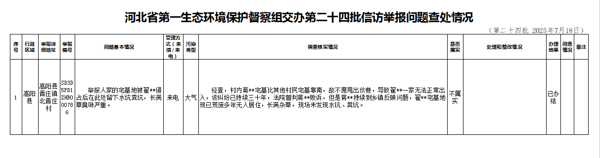 河北省第一生态环境保护督察组交办第二十四批信访举报问题查处情况