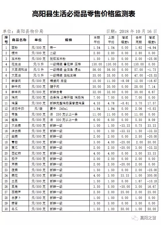 高阳县最新生活必需品零售价格监测表发布