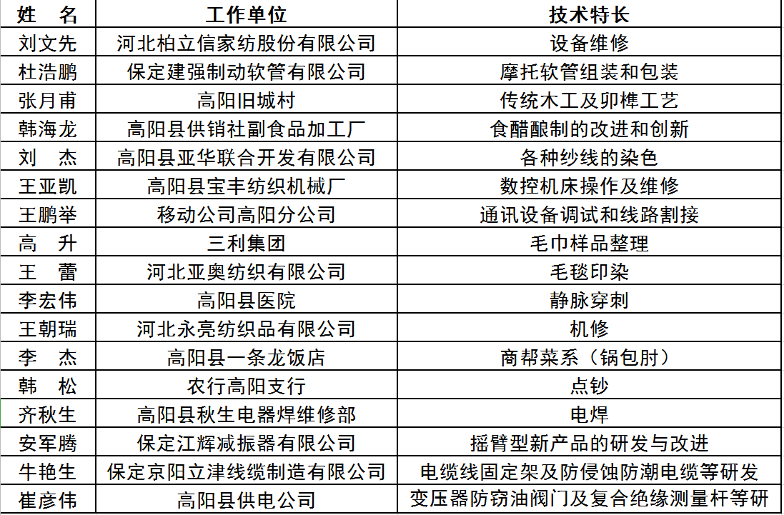 “高阳优秀工匠”评选活动是2019年县政府与总工会联席会议研究确定的主要议题。自今年8月份开始,经组织推荐、个人自荐、考察评定,在全县纺织、印染、电力、电器电料、机械制造、通信、银行、医疗、食品加工、电气焊、木工等行业共评选出17名“高阳优秀工匠”。