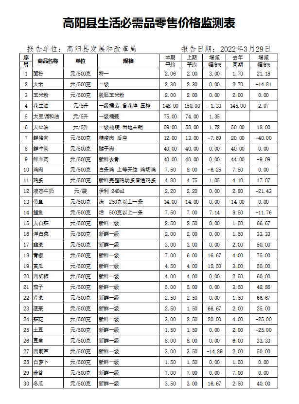 高阳县最新生活必需品零售价格监测表发布