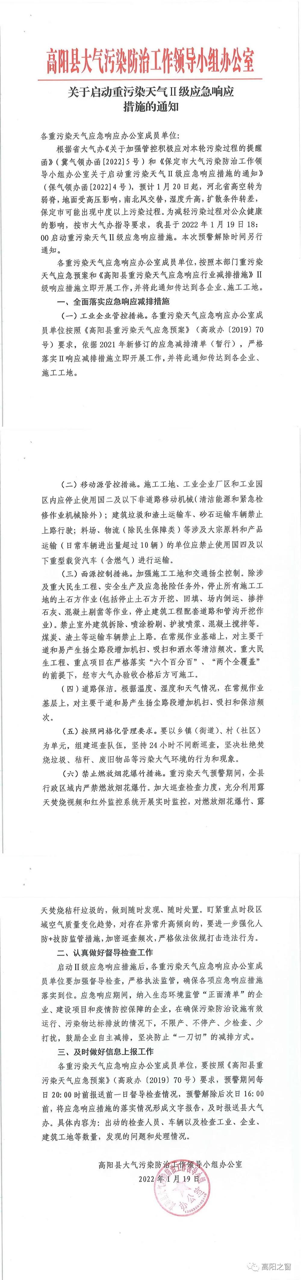 关于启动重污染天气Ⅱ级应急响应措施的通知
