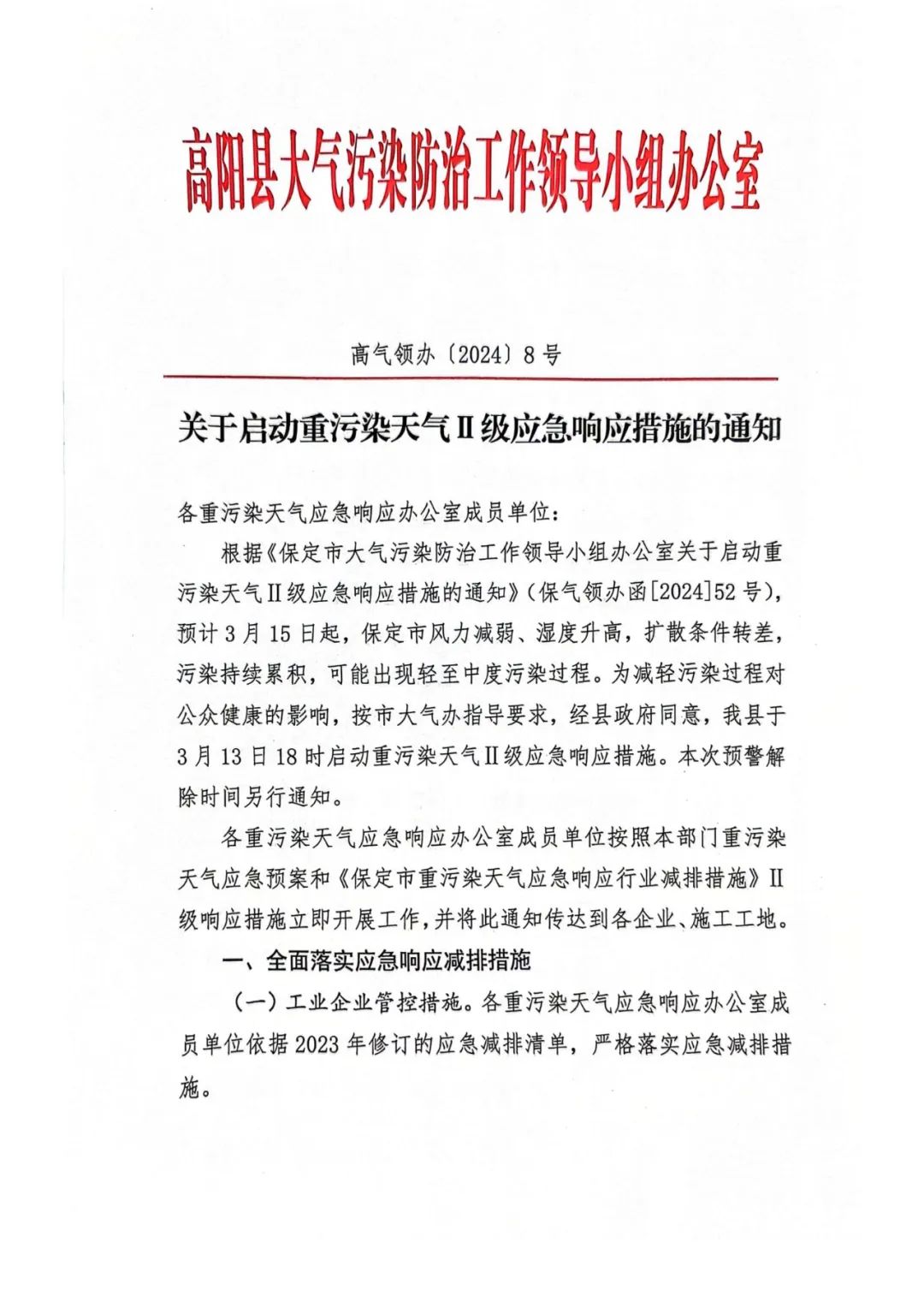 高阳县大气污染防治工作领导小组办公室关于启动重污染天气Ⅱ级应急响应措施的通知
