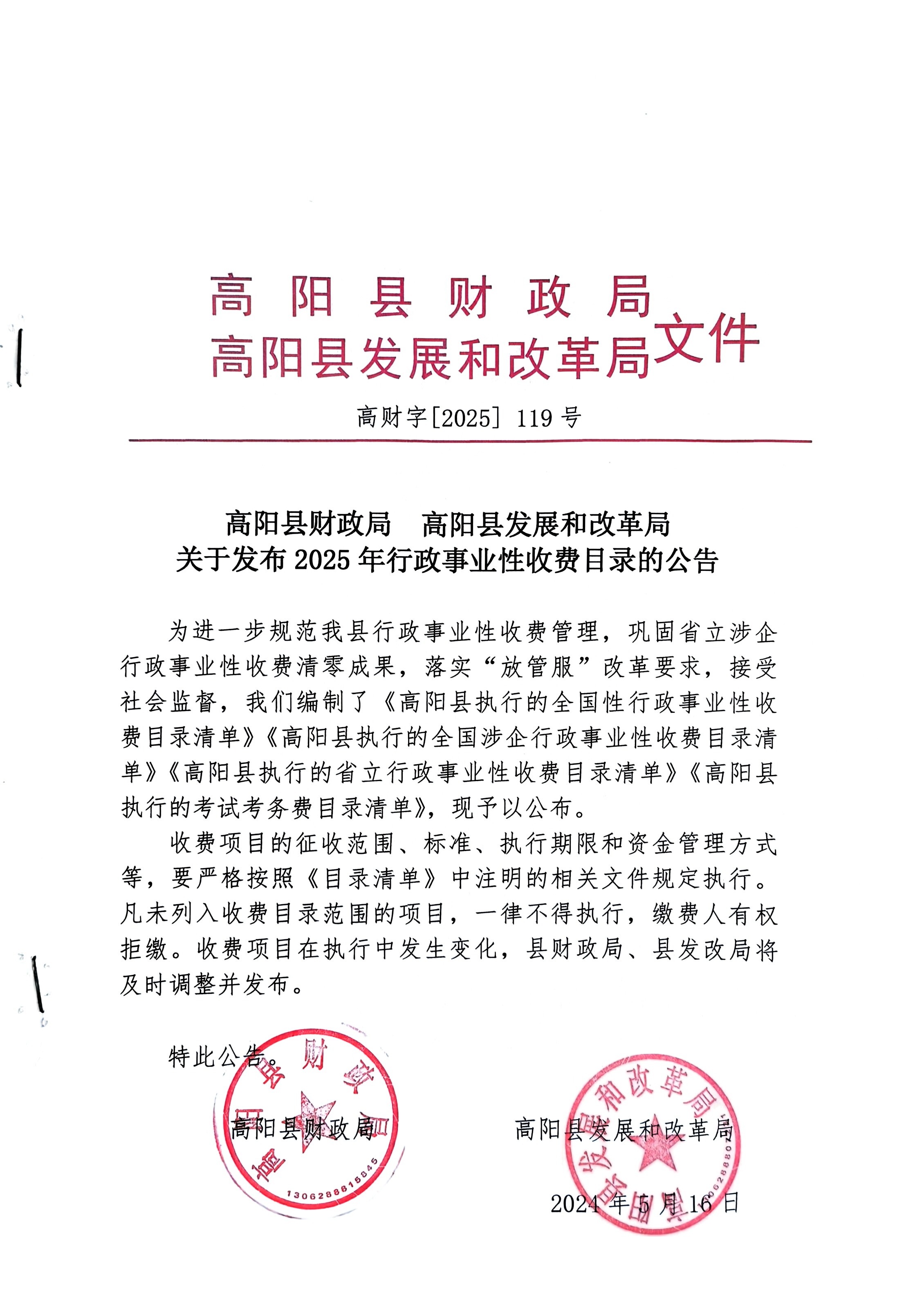 高阳县财政局 高阳县发展和改革局关于发布2025年行政事业性收费目录的公告