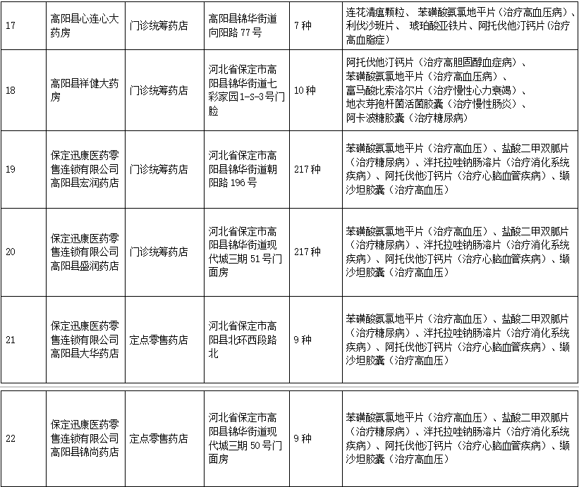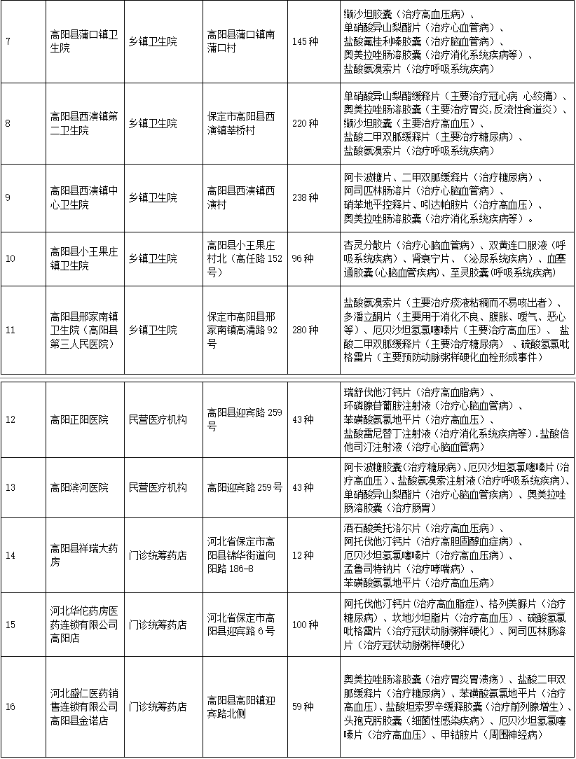 按照省市工作安排,自7月以来高阳县医保局积极响应促进集采药品进基层医疗机构、进民营医疗机构、进零售药店“三进”活动有关要求,持续扩大集采政策覆盖面,让广大群众在更多渠道,实现就近就便购买到质优价宜的集采药品,切实减轻参保群众用药负担。现将全县集采“三进”活动部分定点医药机构公布如下: