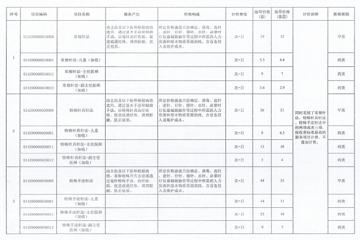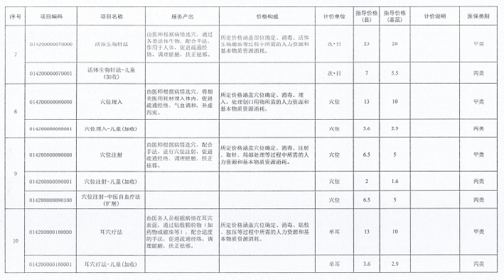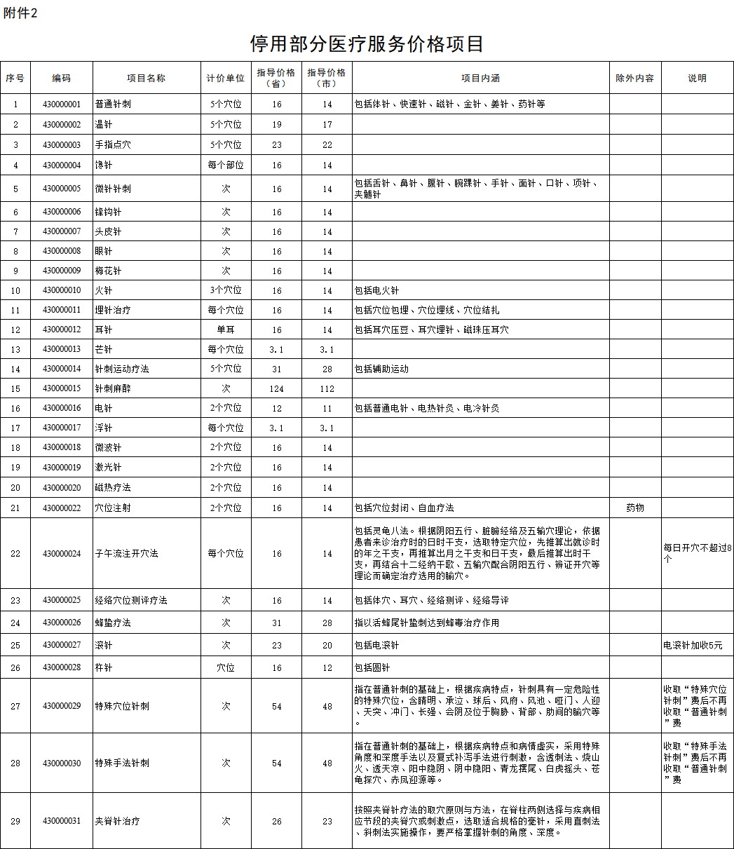 根据保定市医疗保障局 保定市卫生健康委员会《关于规范中医针法类医疗服务价格项目的通知》(保医保〔2025〕13号)文件要求,按照冀医保函〔2025〕13号精神,调整中医针法类医疗服务价格项目,并按价格管理权限制定我市县级及以下医疗机构指导价格(见附件);停用“馋针、锋钩针”等29项医疗服务价格项目(见附件)。