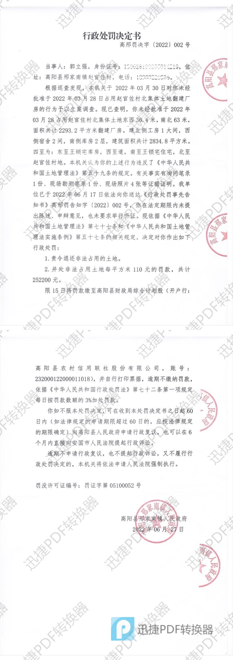 邢家南镇人民政府于2022年06月27日对郭立强下达了行政处罚决定书《高邢罚决字【2022】002号》。