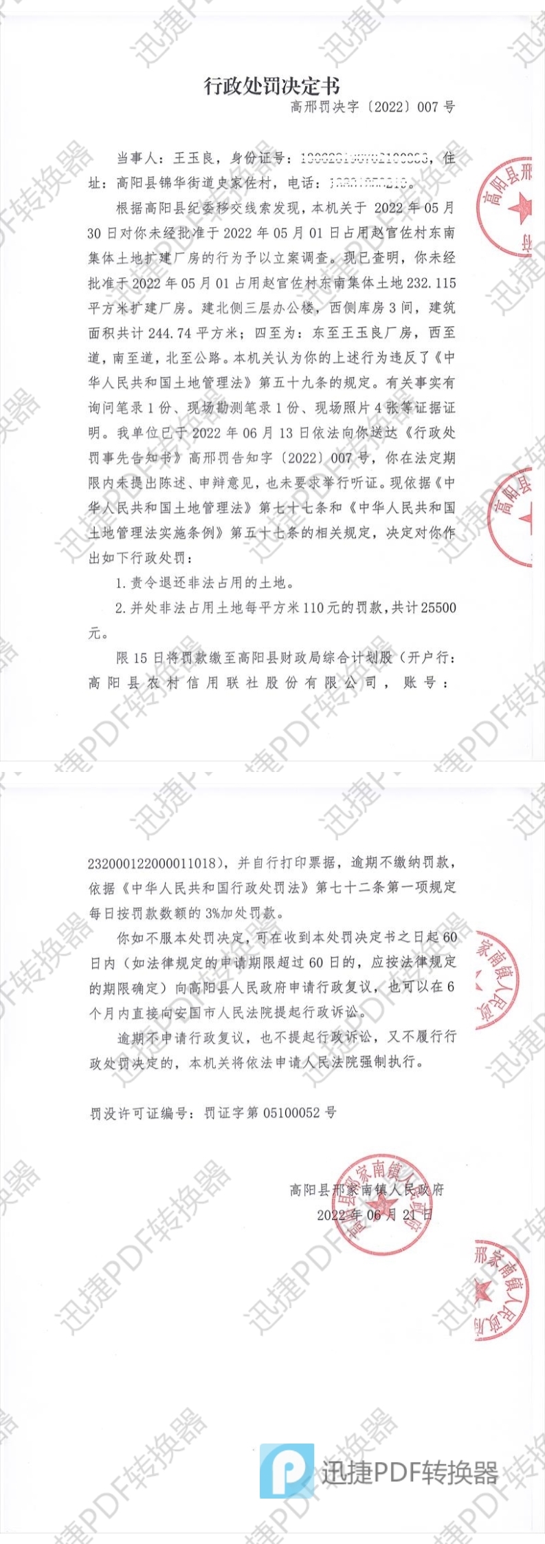 邢家南镇人民政府于2022年06月21日对王玉良下达了行政处罚决定书《高邢罚决字【2022】007号》。