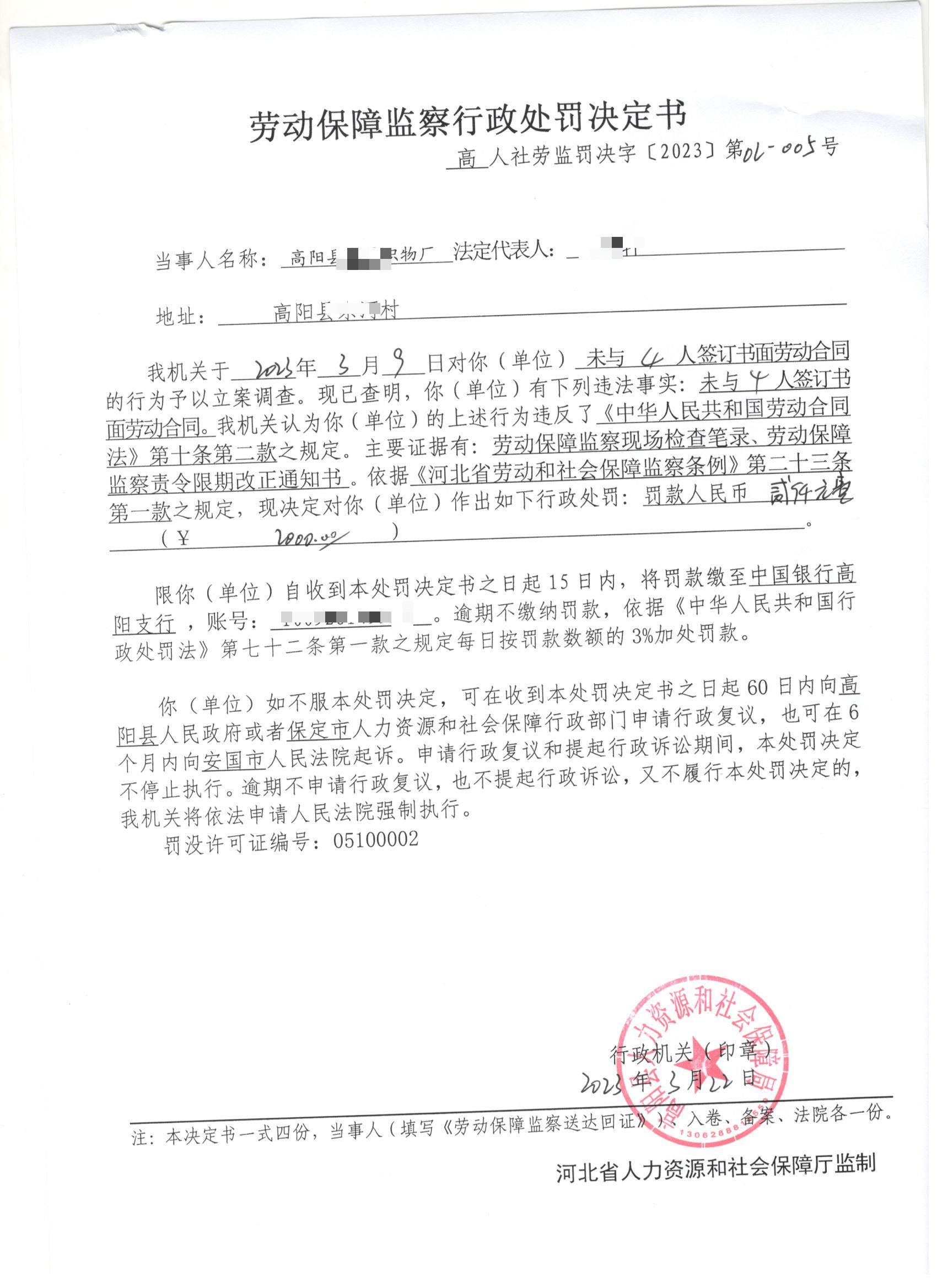 劳动保障监察行政处罚决定书 - 高人社劳监罚决字〔2023〕第02 - 005号