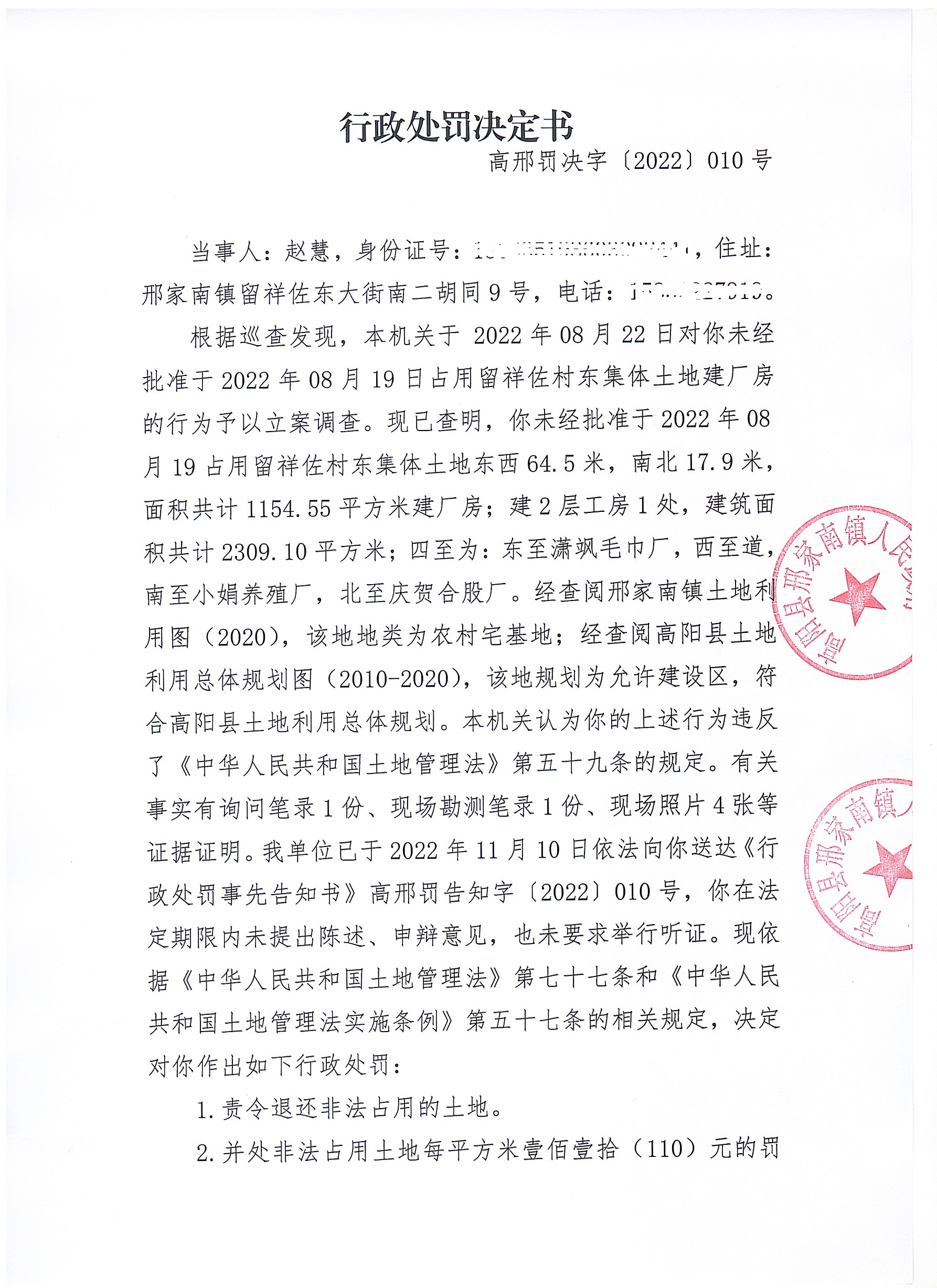 高阳县邢家南镇人民政府于2022年11月18日依法向赵慧送达《行政处罚决定书》高邢罚决字〔2022〕010号。