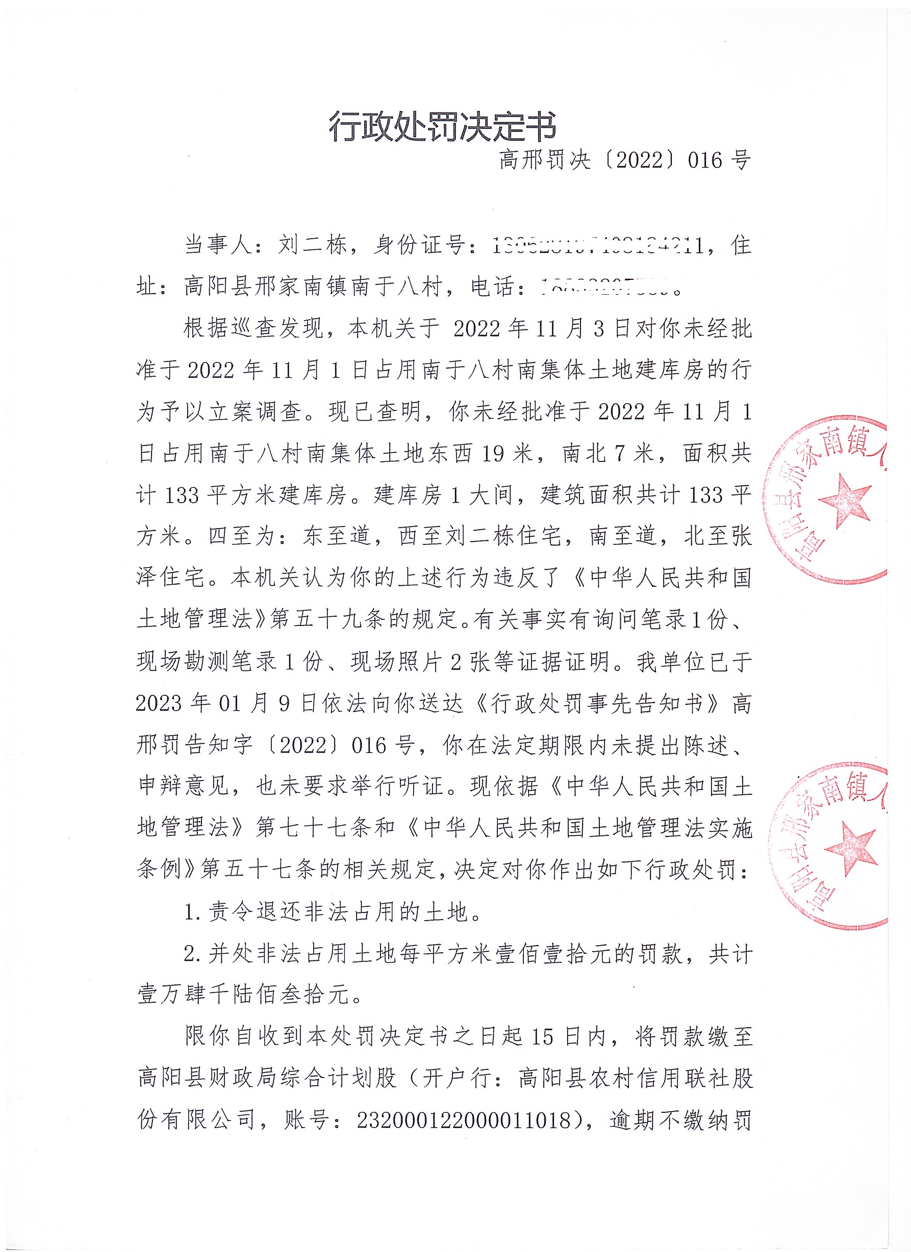 高阳县邢家南镇人民政府于2023年01月17日依法向刘二栋下达了《行政处罚决定书》高邢罚决字〔2022〕016号。