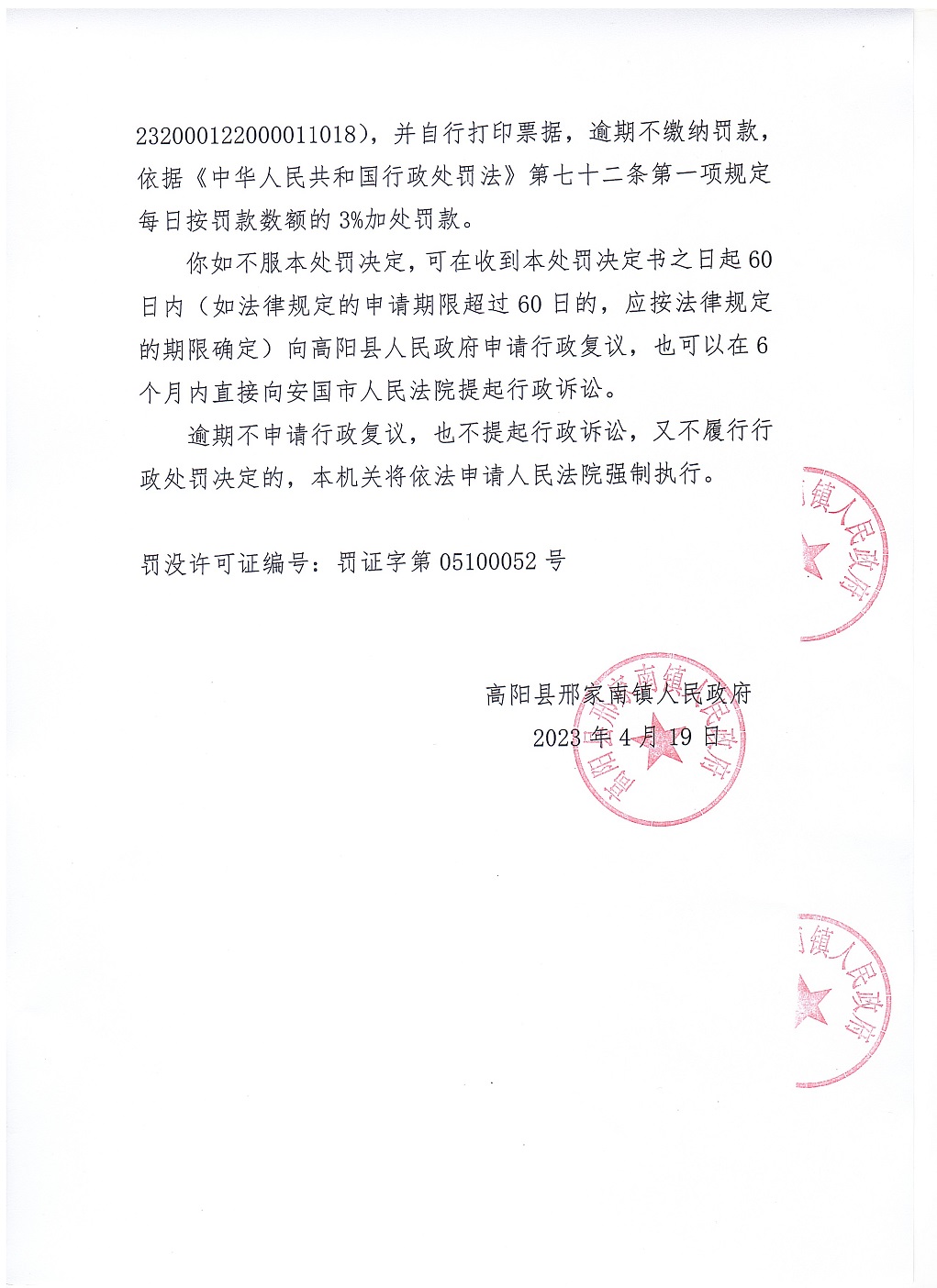 高阳县邢家南镇人民政府于2023年4月19日依法向葛兰尊送达《行政处罚决定书》高邢罚决字〔2023〕002号。