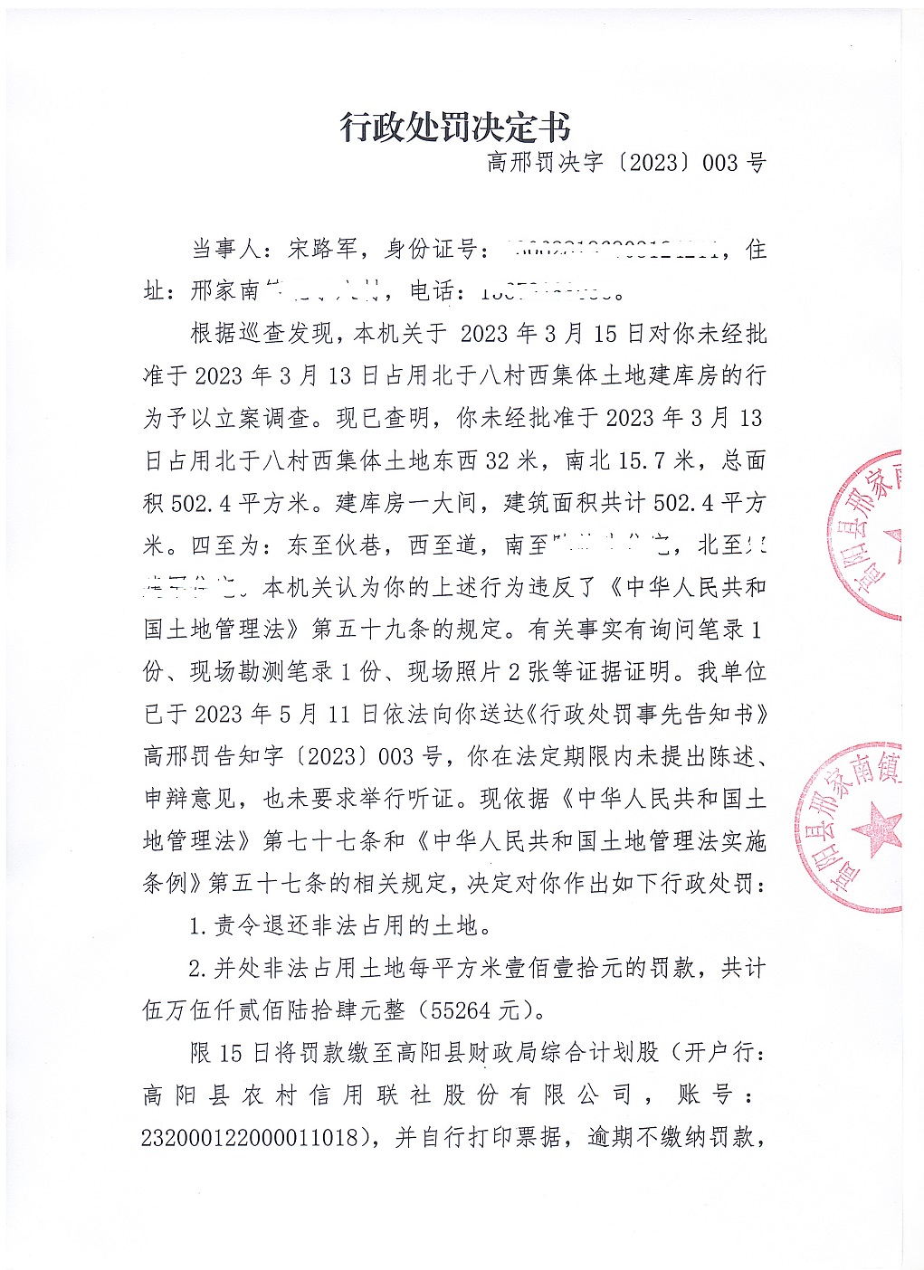 高阳县邢家南镇人民政府于2023年5月19日依法向宋路军送达《行政处罚决定书》高邢罚决字〔2023〕003号。