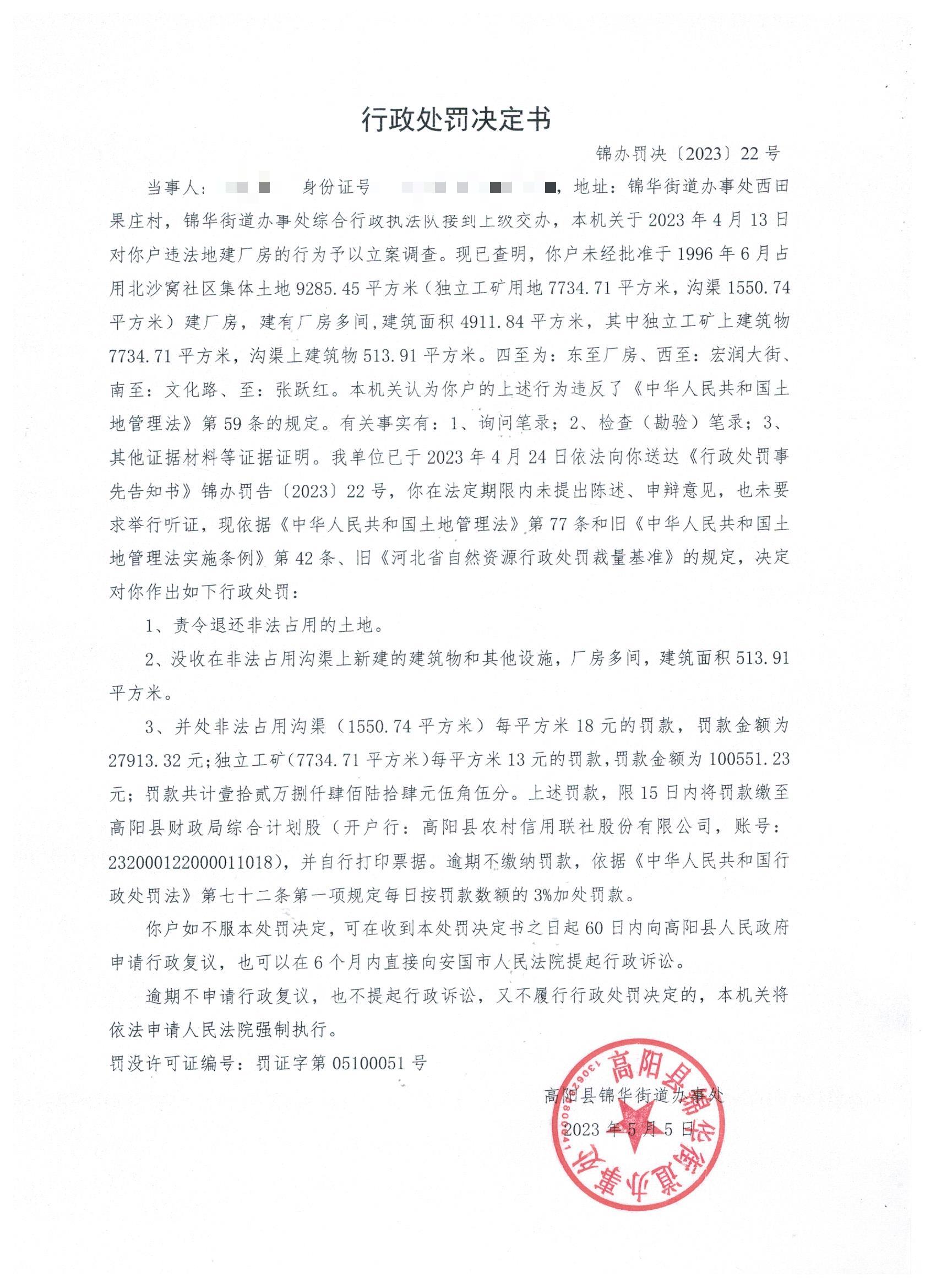 锦办罚决(2023)22号