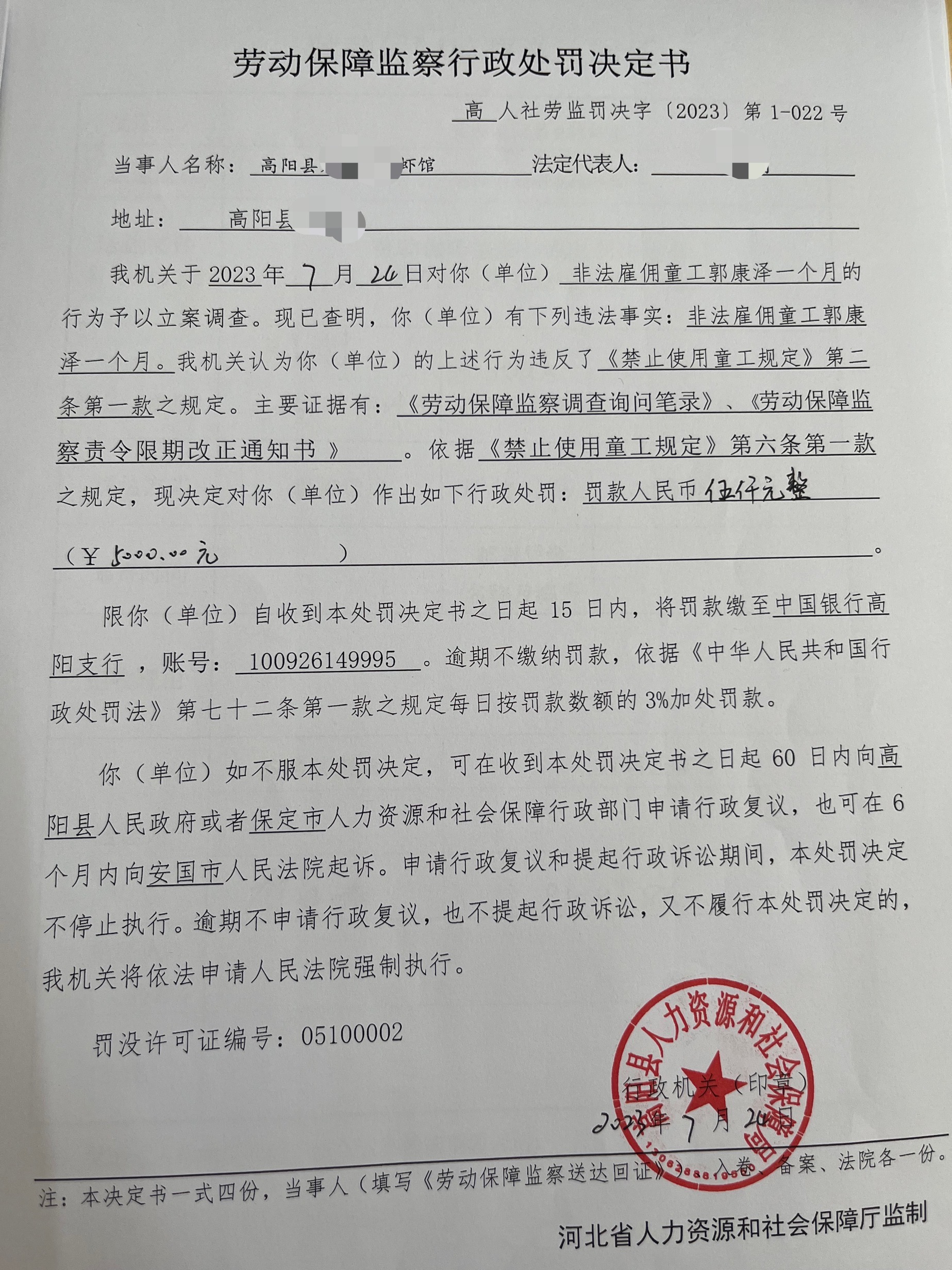 劳动保障监察行政处罚决定书 - 高人社劳监罚决字〔2023〕第1 - 022号