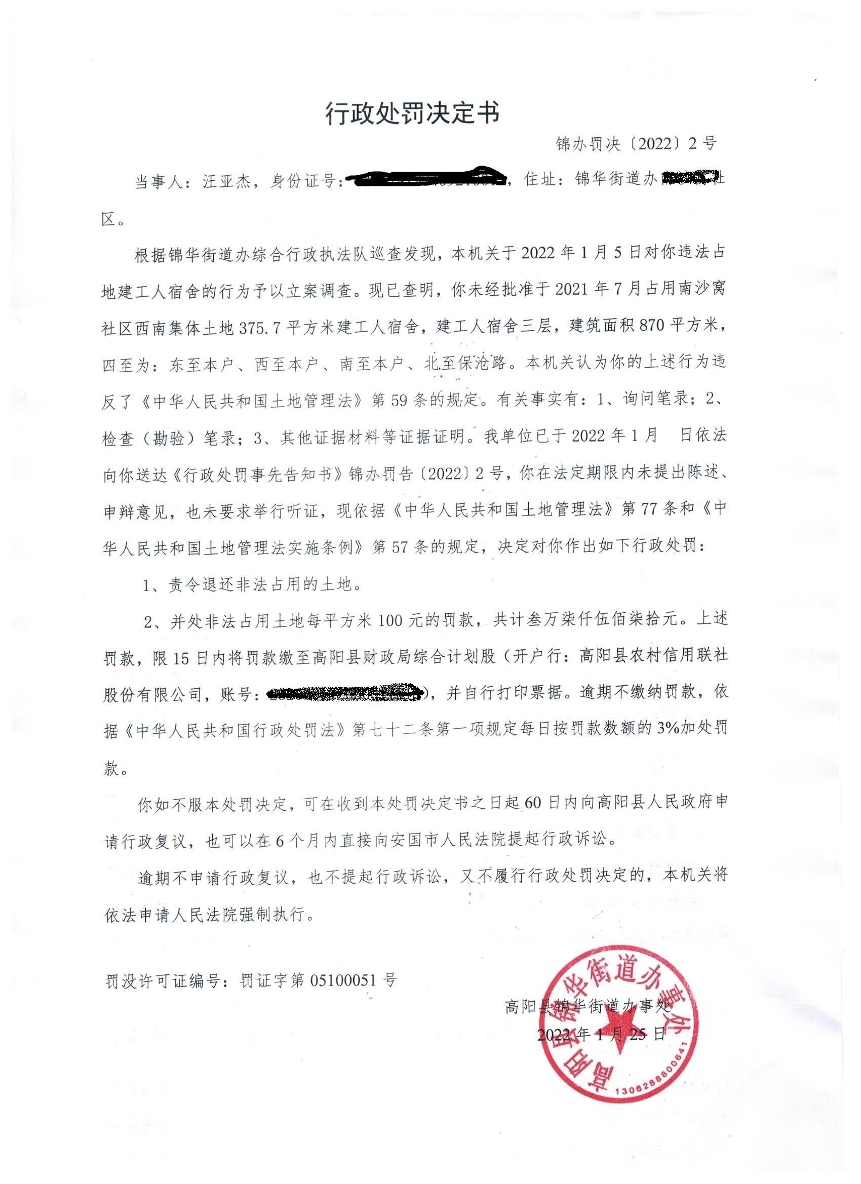 锦办罚决【2022】002号