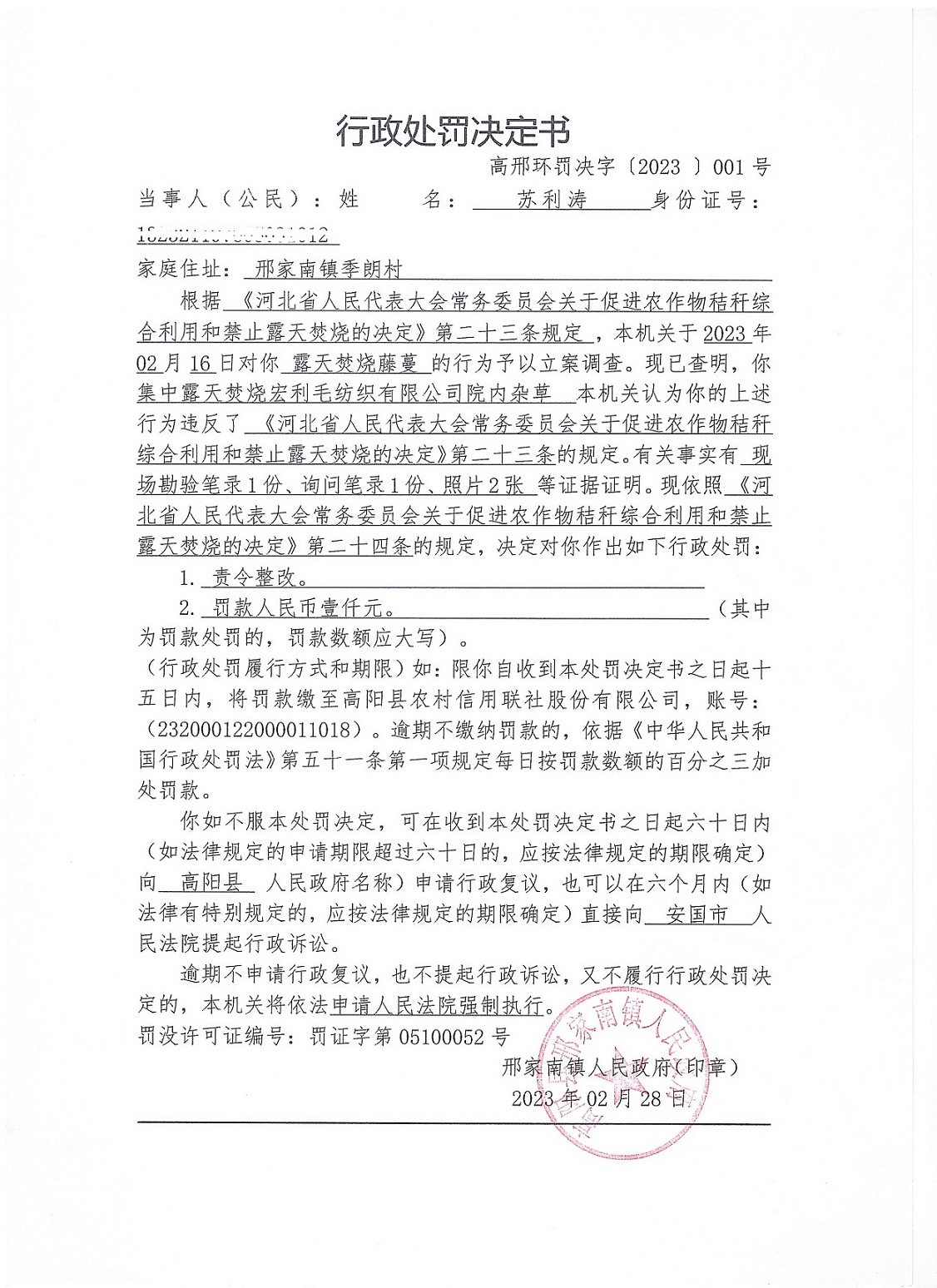 高阳县邢家南镇人民政府于2023年2月28日依法向苏利涛送达《行政处罚决定书》高邢环罚决字〔2023〕001号。