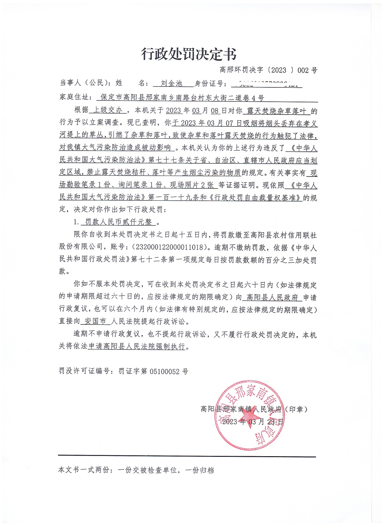 高阳县邢家南镇人民政府于2023年3月23日依法向刘金池送达《行政处罚决定书》高邢环罚决字〔2023〕002号。