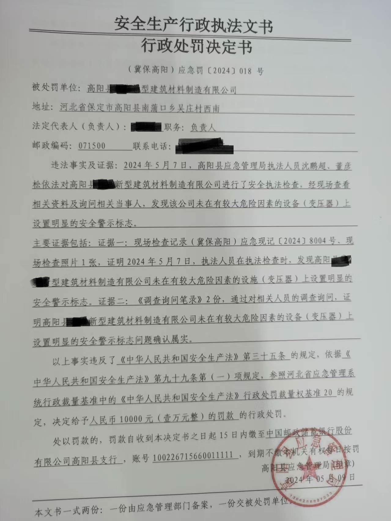 2024年高阳县应急管理局行政处罚决定书018