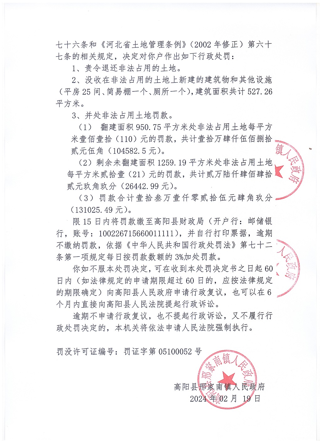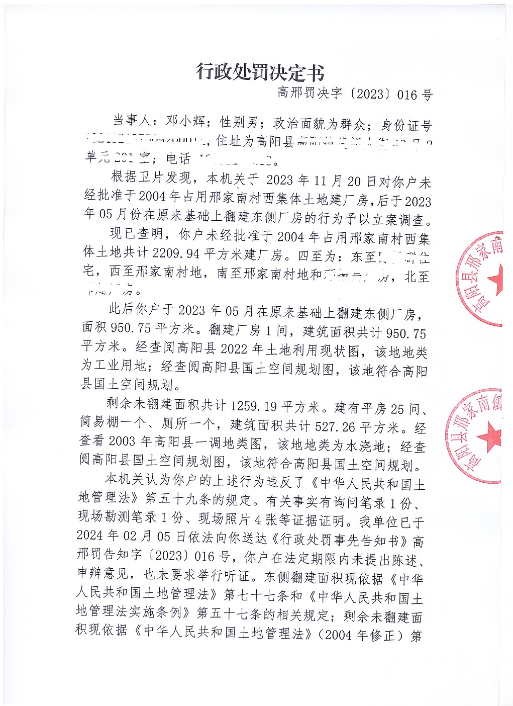 高阳县邢家南镇人民政府于2024年02月19日依法向邓小辉送达了《行政处罚决定书》高邢罚决字〔2023〕016号。