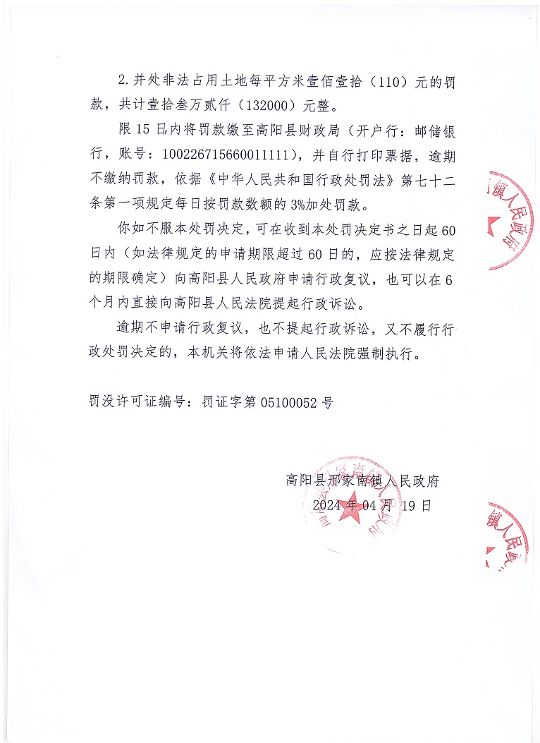 高阳县邢家南镇人民政府于2024年04月19日依法向张伟送达《行政处罚决定书》高邢罚决字〔2024〕003号。