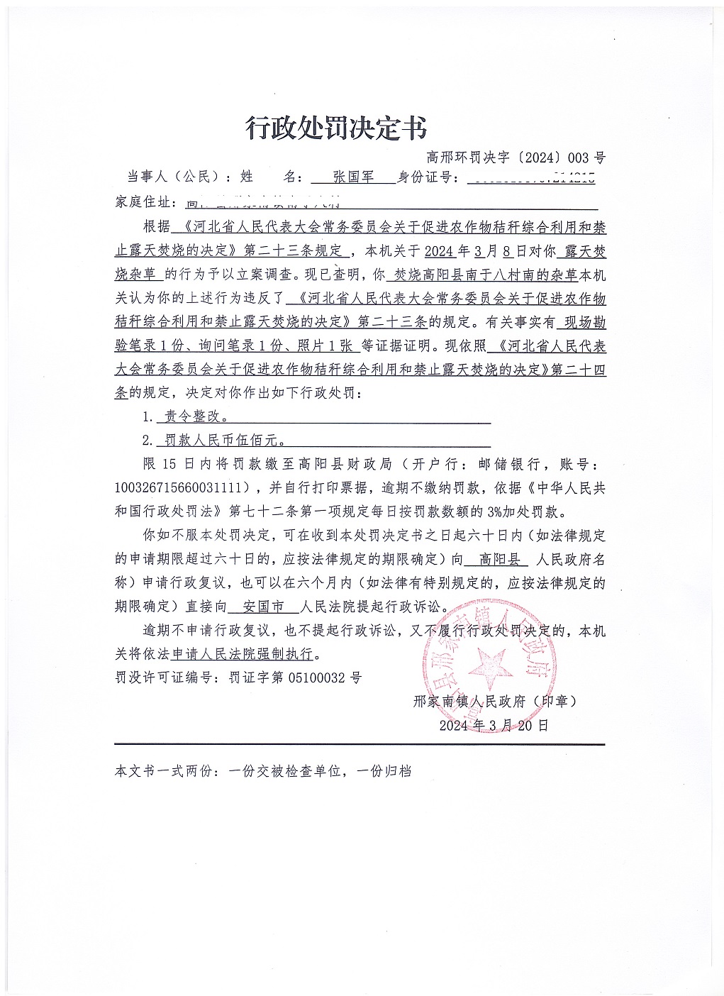 高阳县邢家南镇人民政府于2024年3月20日依法向张国军送达《行政处罚决定书》高邢环罚决字〔2024〕003号。