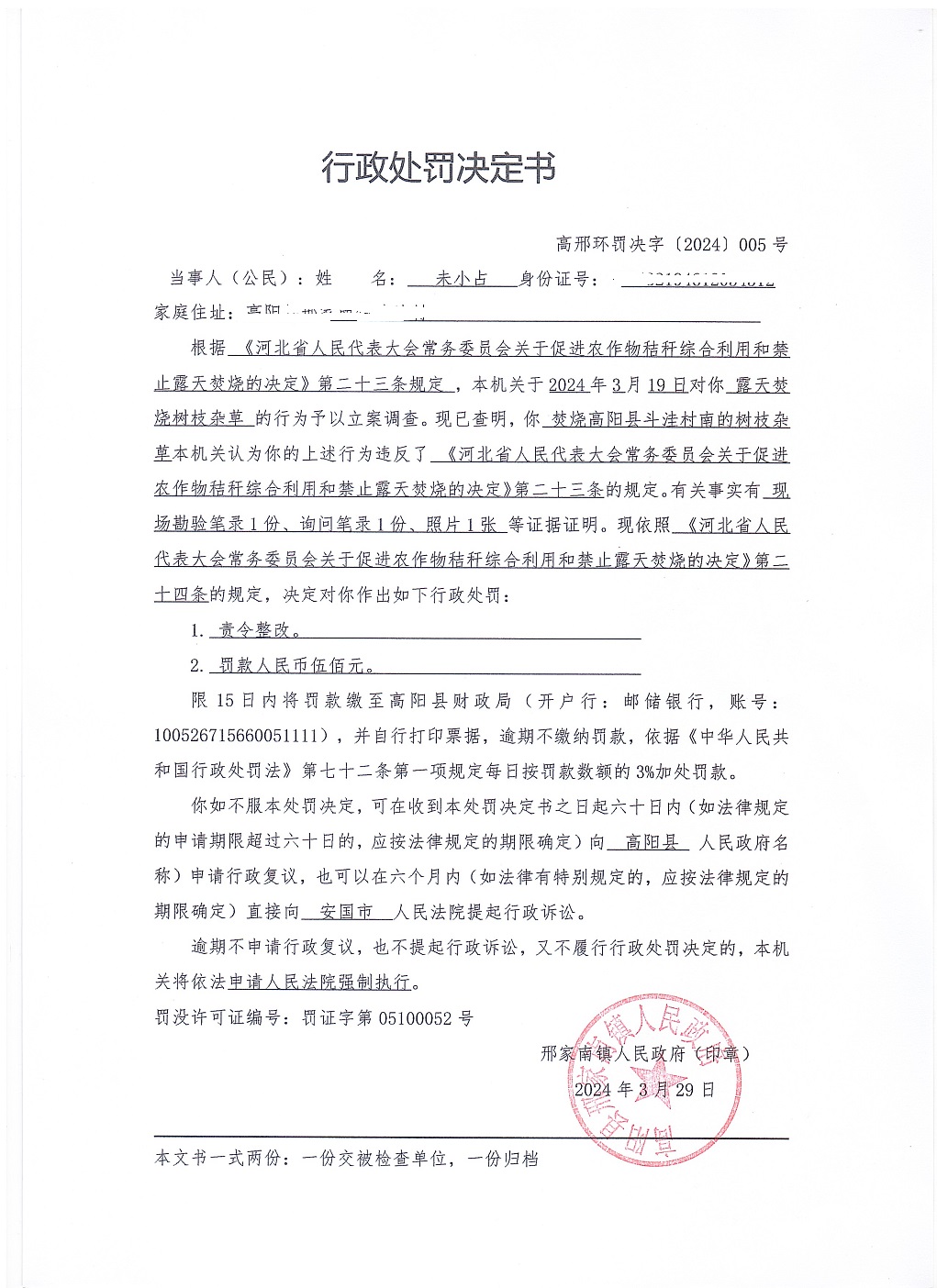 高阳县邢家南镇人民政府于2024年3月29日依法向未小占送达《行政处罚决定书》高邢环罚决字〔2024〕005号。