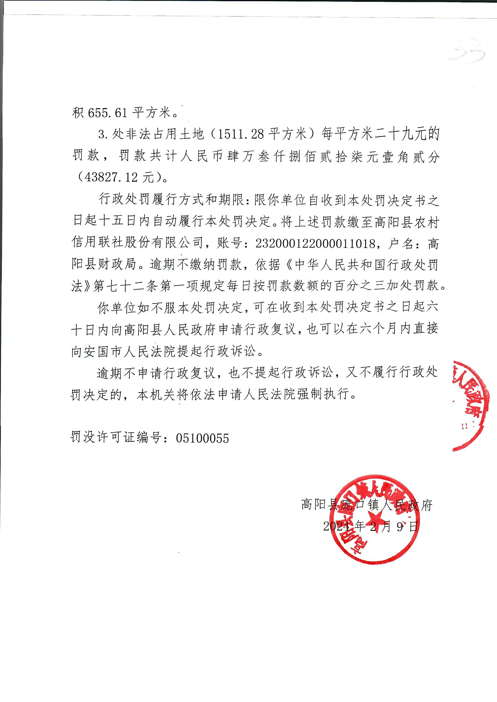 《行政处罚决定书》高庞口罚决【2024】6号