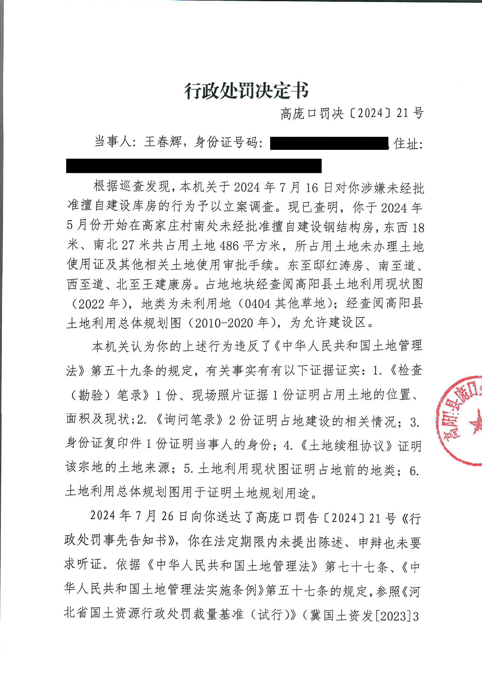《行政处罚决定书》高庞口罚决【2024】21号