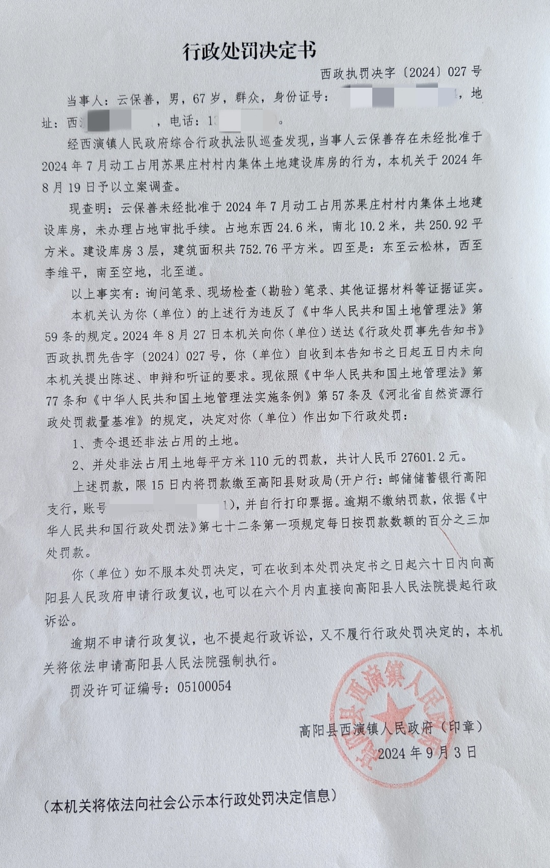 《行政处罚决定书》西政执罚决字〔2024〕027号