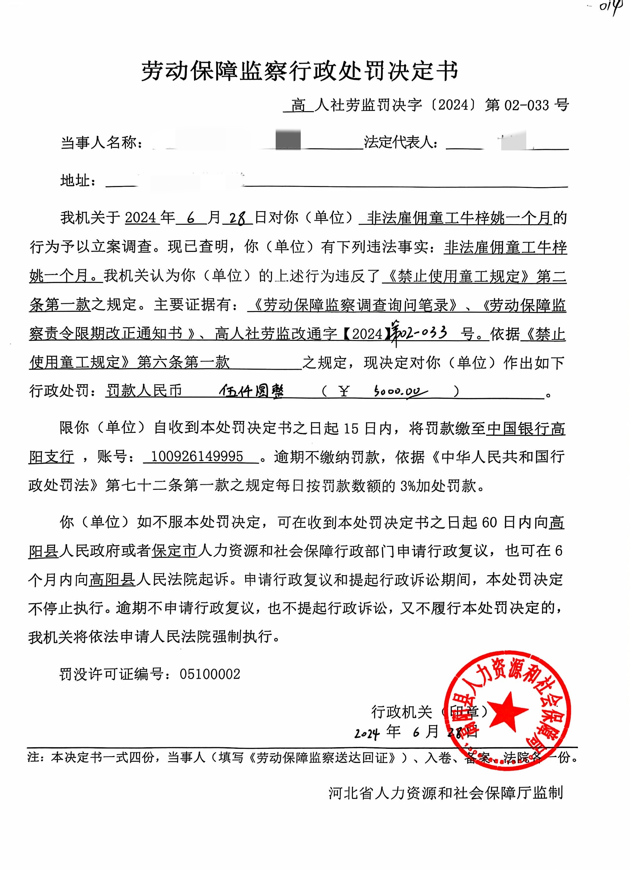 劳动保障监察行政处罚决定书 - 高人社劳监罚决字〔2024〕第02 - 033号