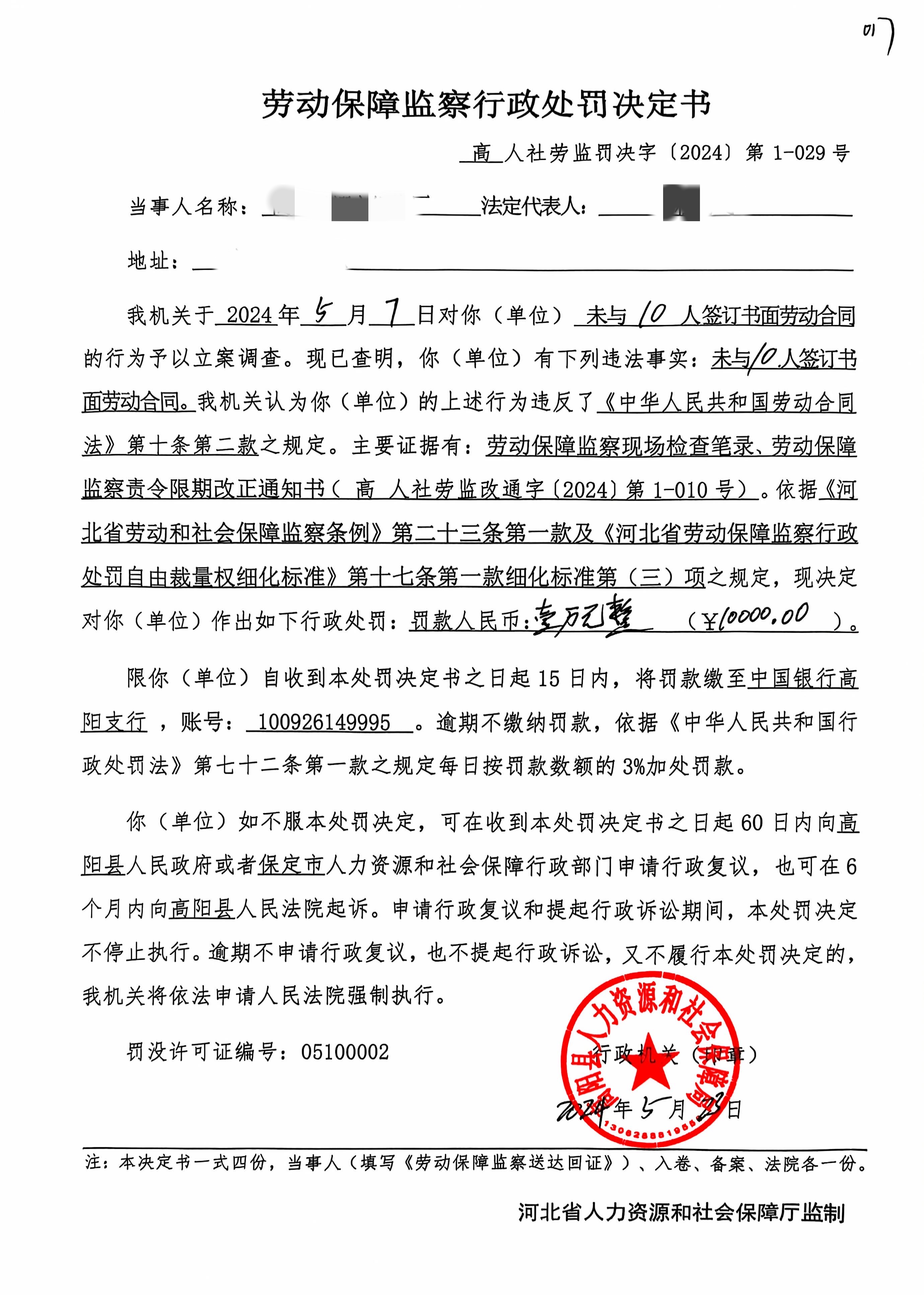 劳动保障监察行政处罚决定书 - 高人社劳监罚决字〔2024〕第1 - 029号