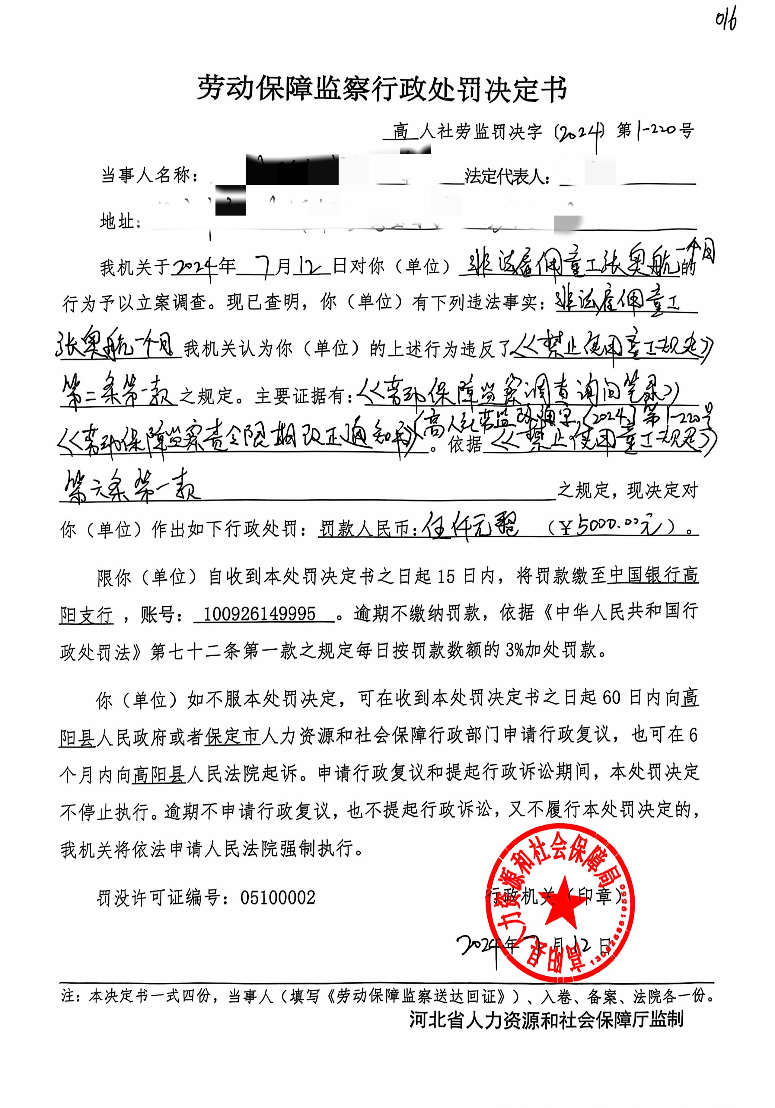 劳动保障监察行政处罚决定书 - 高人社劳监罚决字〔2024〕第1 - 220号