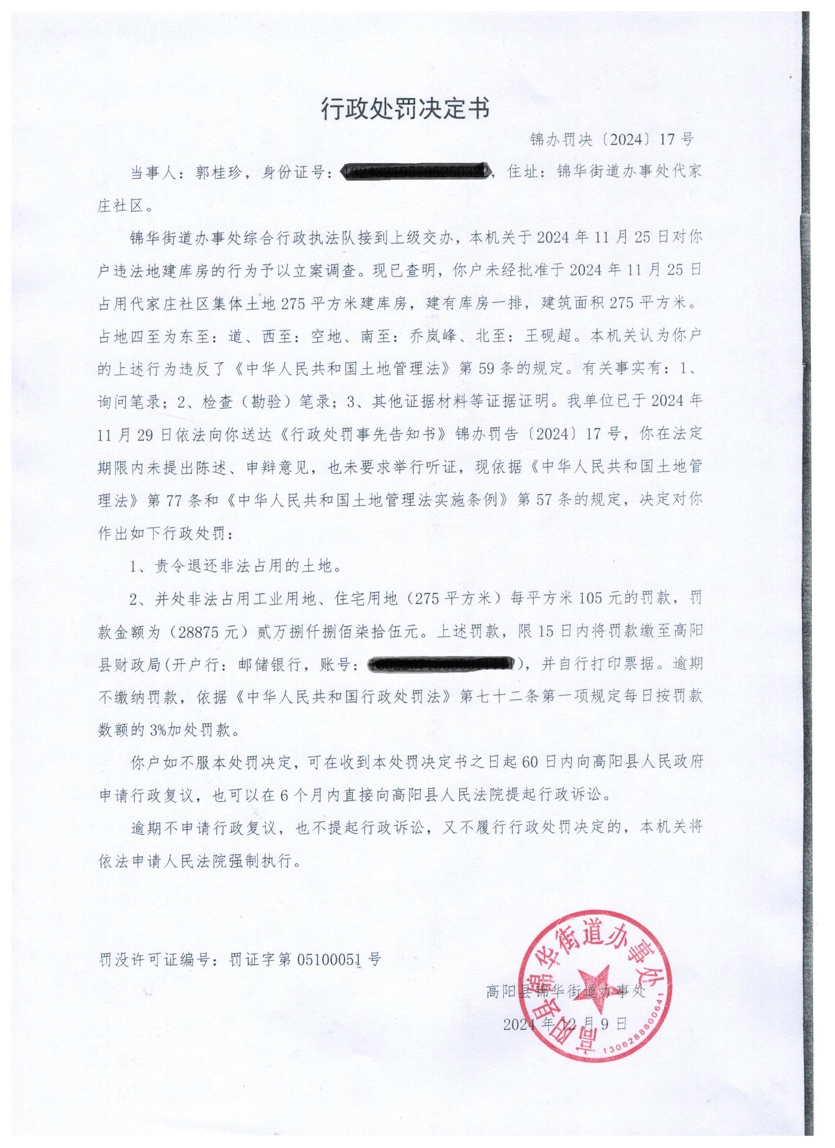 锦办罚决(2024)17号