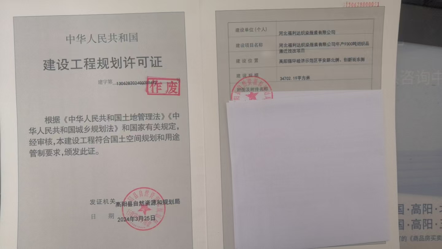 因变更河北福利达织染服装有限公司年产9300吨纺织品搬迁技改项目原工程证作废