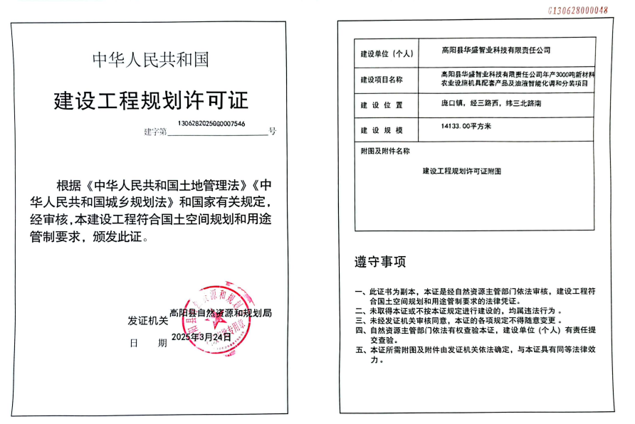 高阳县华盛智业科技有限责任公司年产3000吨新材料农业设施机具配套产品及油液智能化调和分装项目