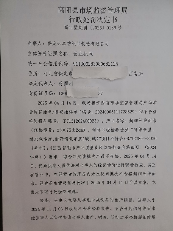 保定云卓纺织品制造有限公司以不合格产品冒充合格产品案