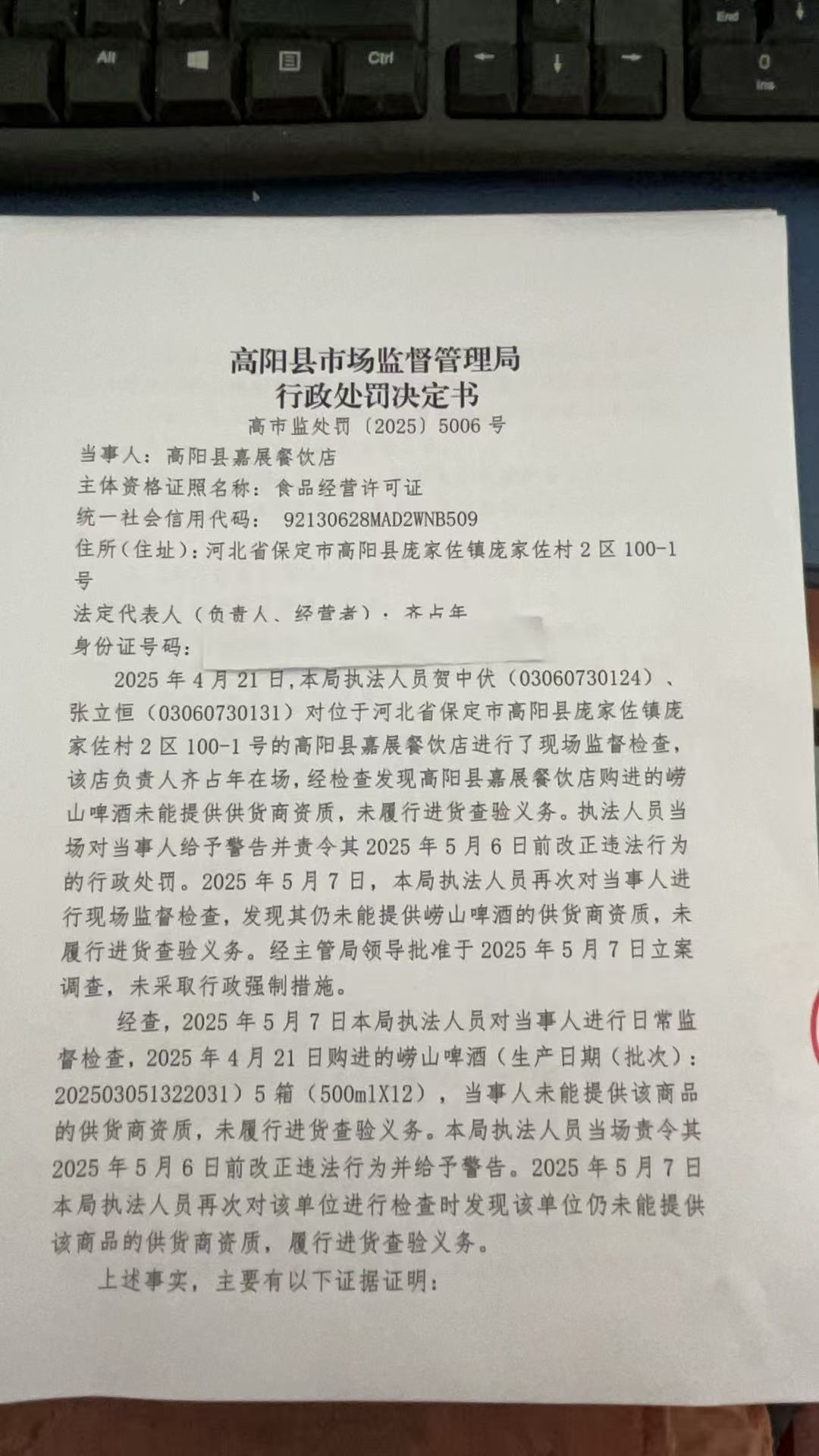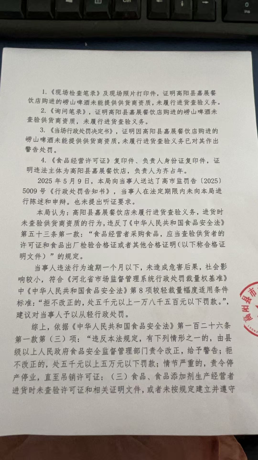 高阳县嘉展餐饮店未履行进货查验义务案