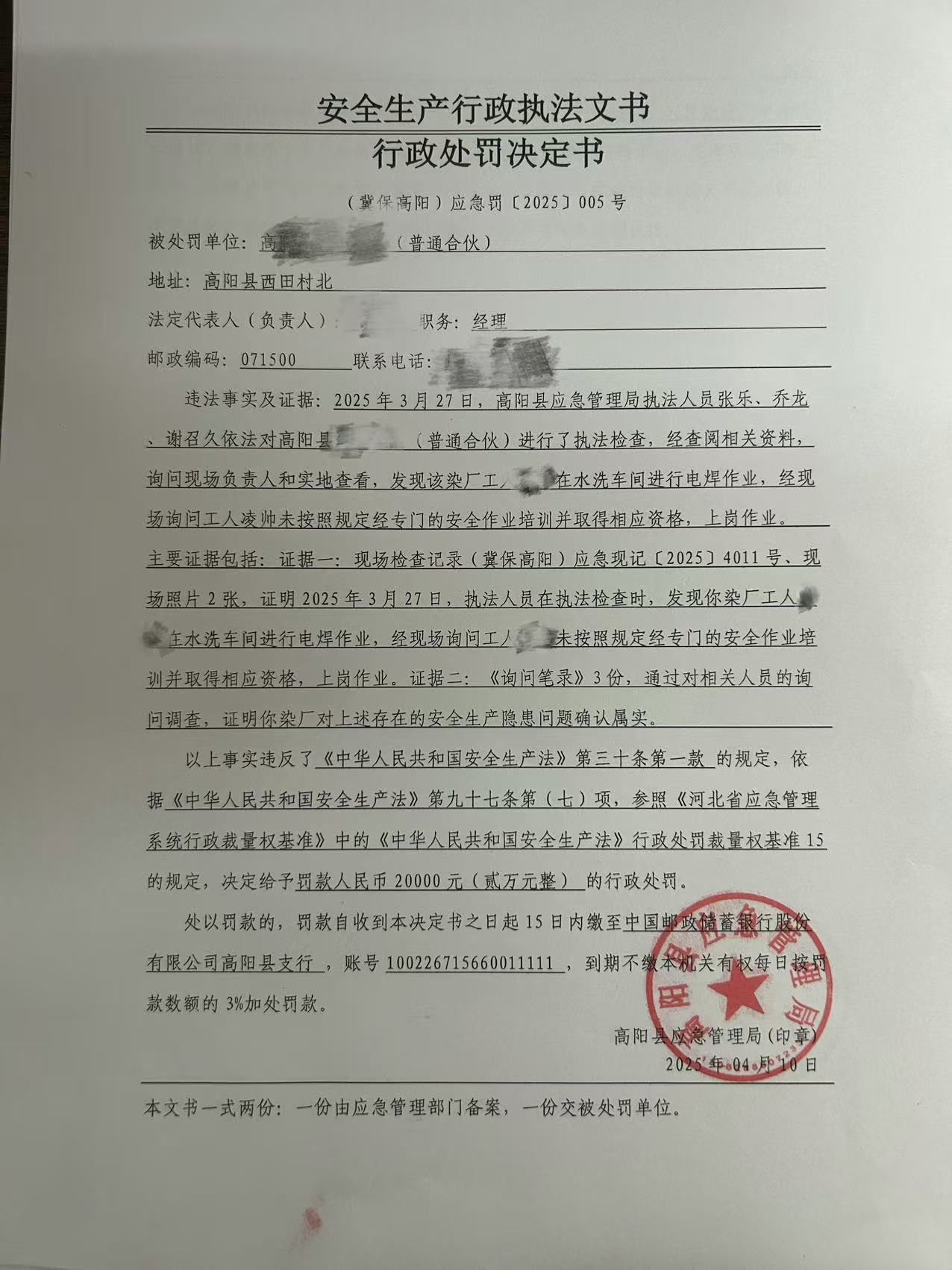 2025年高阳县应急管理局行政处罚决定书005