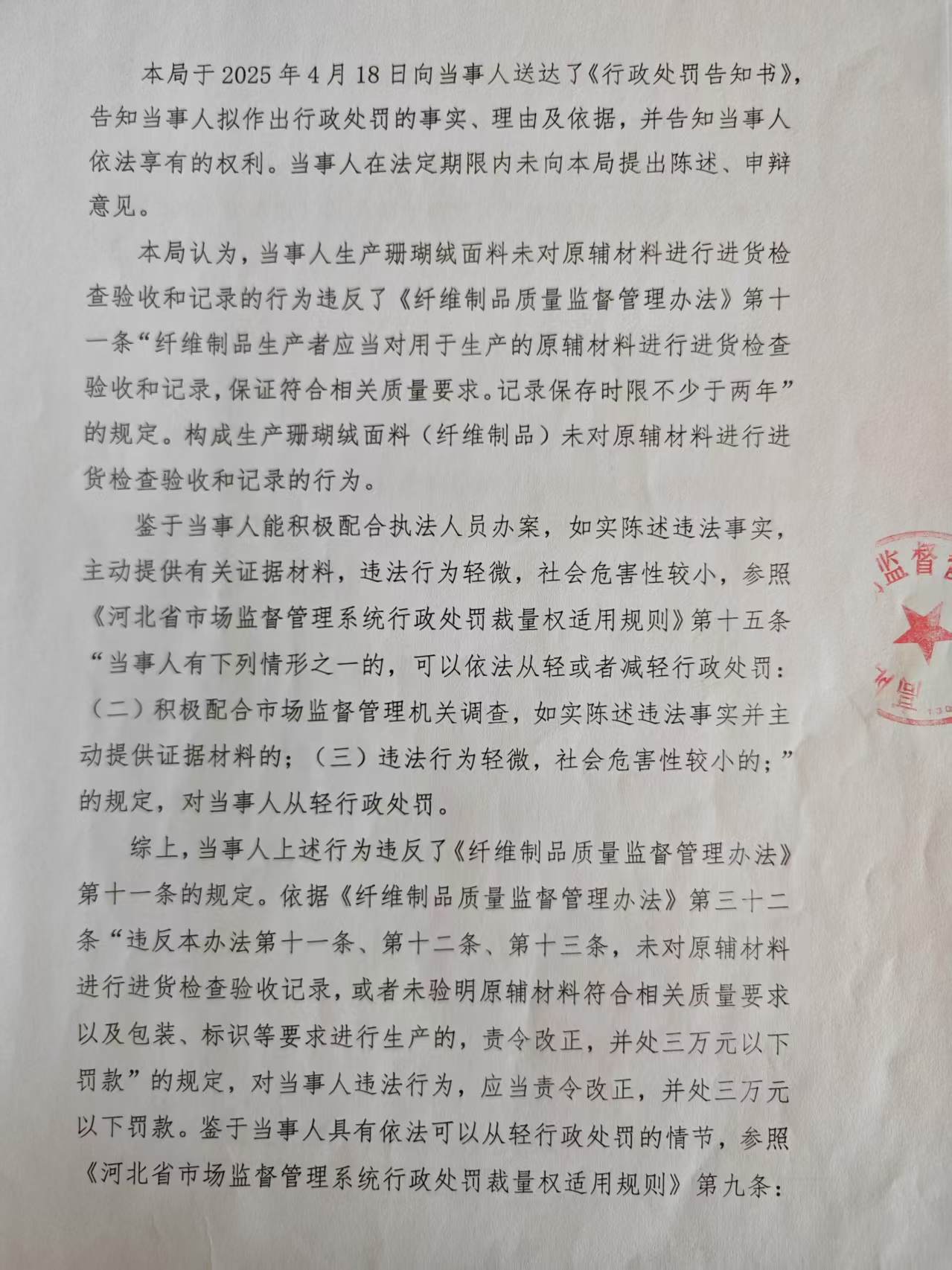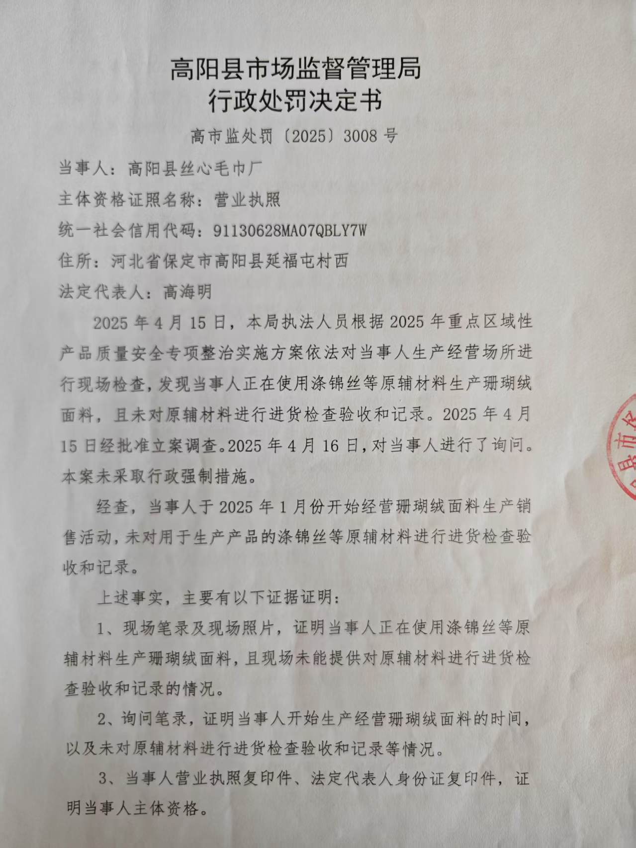 高阳县丝心毛巾厂生产珊瑚绒面料未对原辅材料进行进货检查验收和记录案