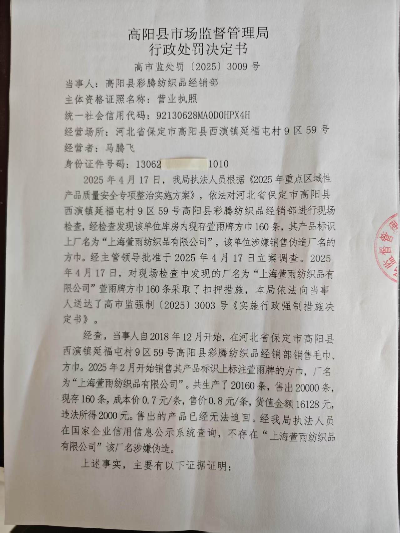 高阳县彩腾纺织品经销部销售伪造厂名方巾案