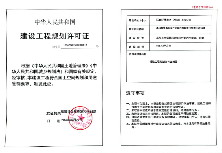 高阳县生态印染产业园污水集中预处理工程项目建设工程规划许可证
